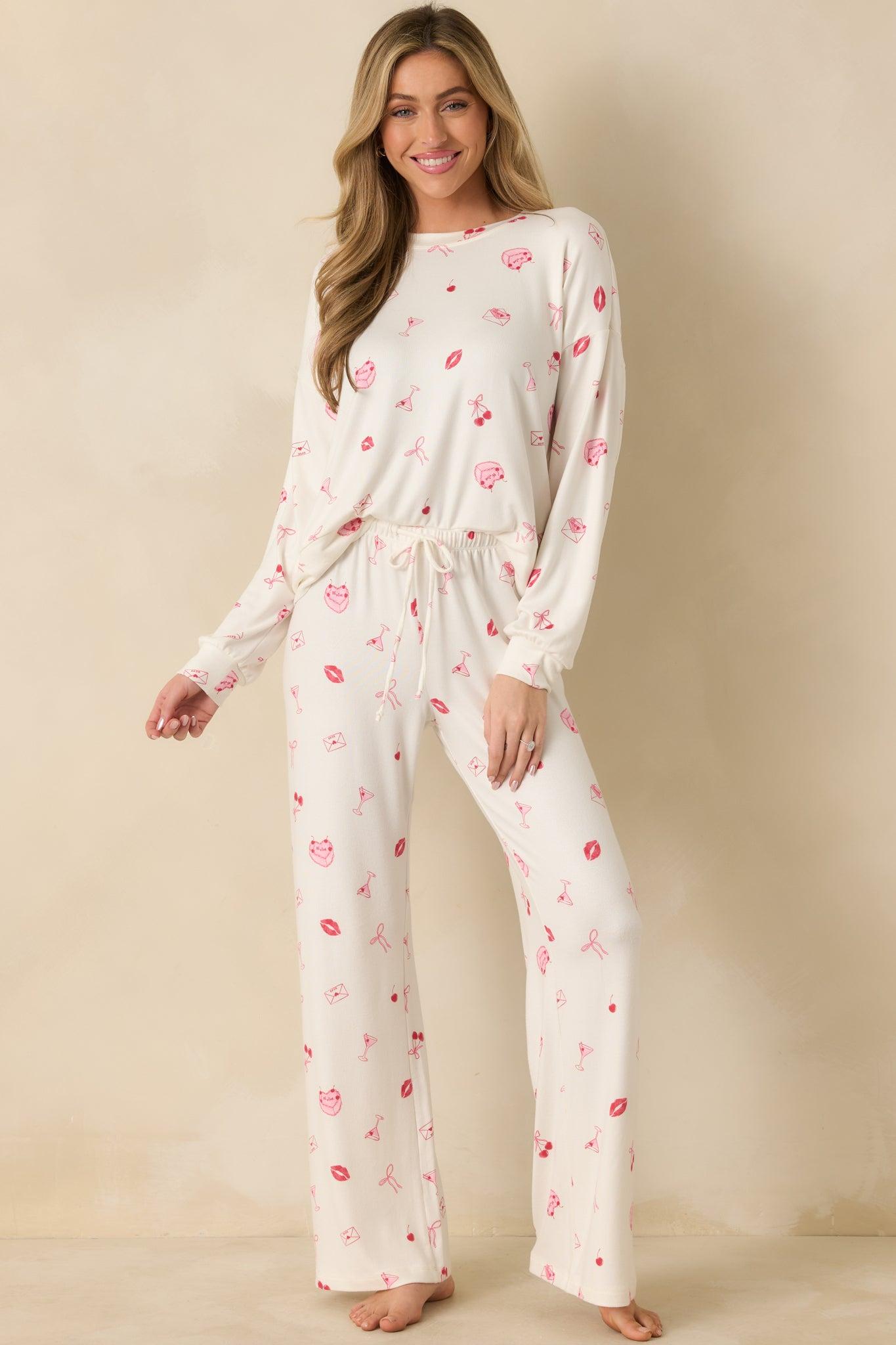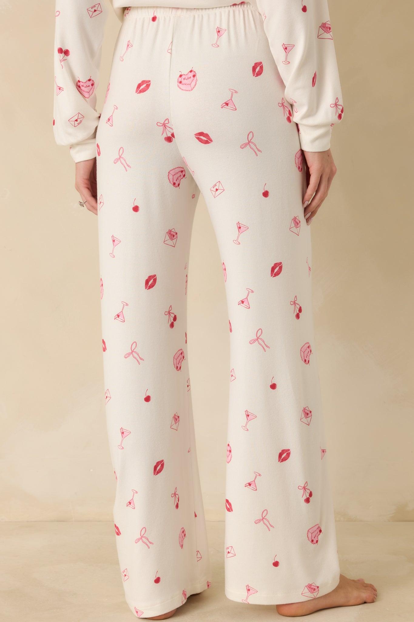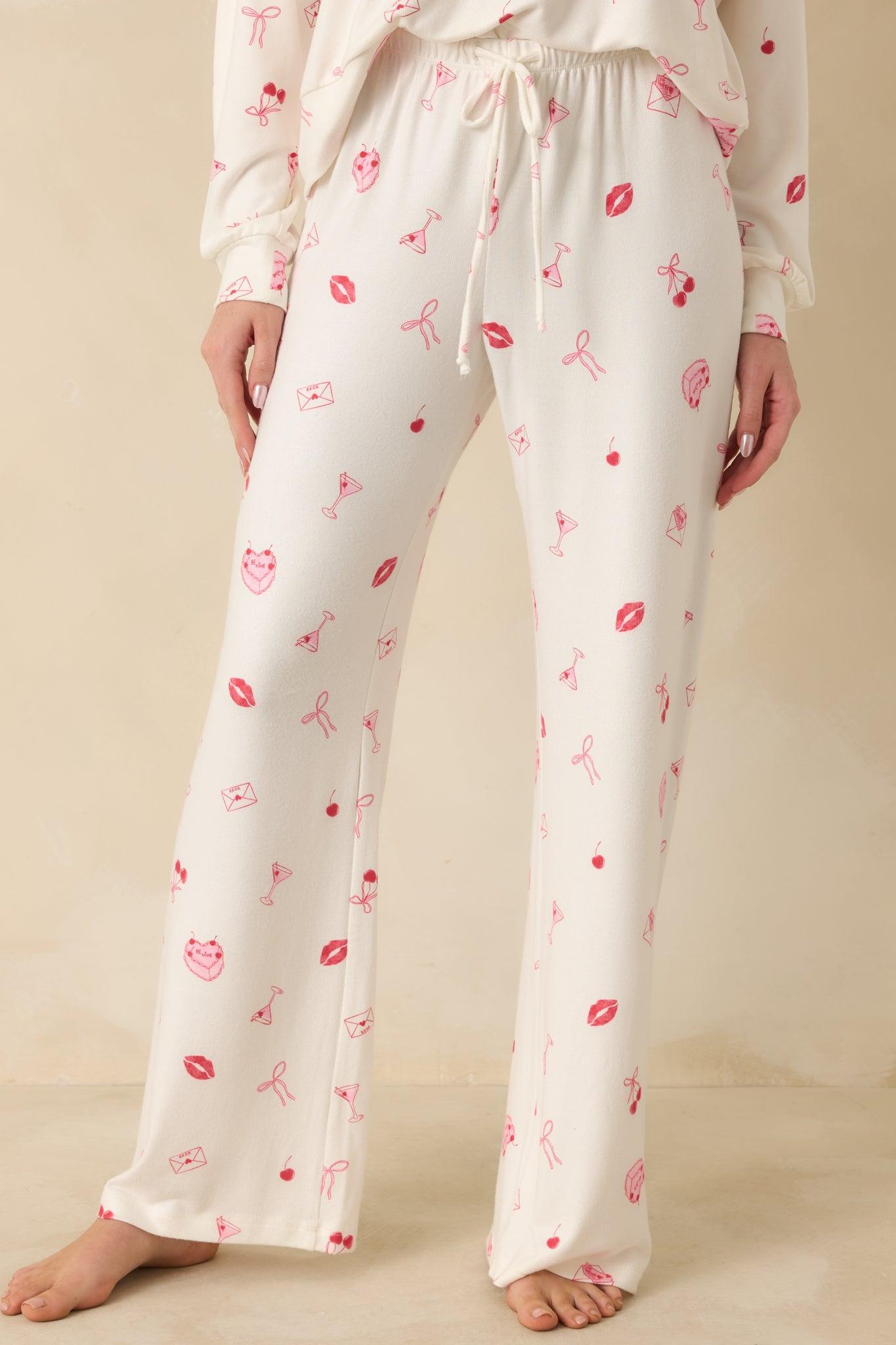 The Z Supply Ivory Multi So Sweet Pajama Pants are made for cozy nights and slow mornings, featuring a charming mix of hearts, cherries, bows, and love notes throughout. Soft, relaxed, and sweet without feeling overdone, they’re perfect for lounging in, gifting, or pairing with the matching top for a feel-good set. These ivory pajama pants are crafted from a soft knit fabric with an allover pink novelty print. Designed with a relaxed, straight-leg fit, they feature an elastic waistband with an adjustable drawstring and a comfortable, easy drape for all-day lounging.95% Polyester & 5% SpandexUnlinedMachine Wash ColdManufactured in ChinaDesigned in the USAModel is 5'8" and wearing size x-small