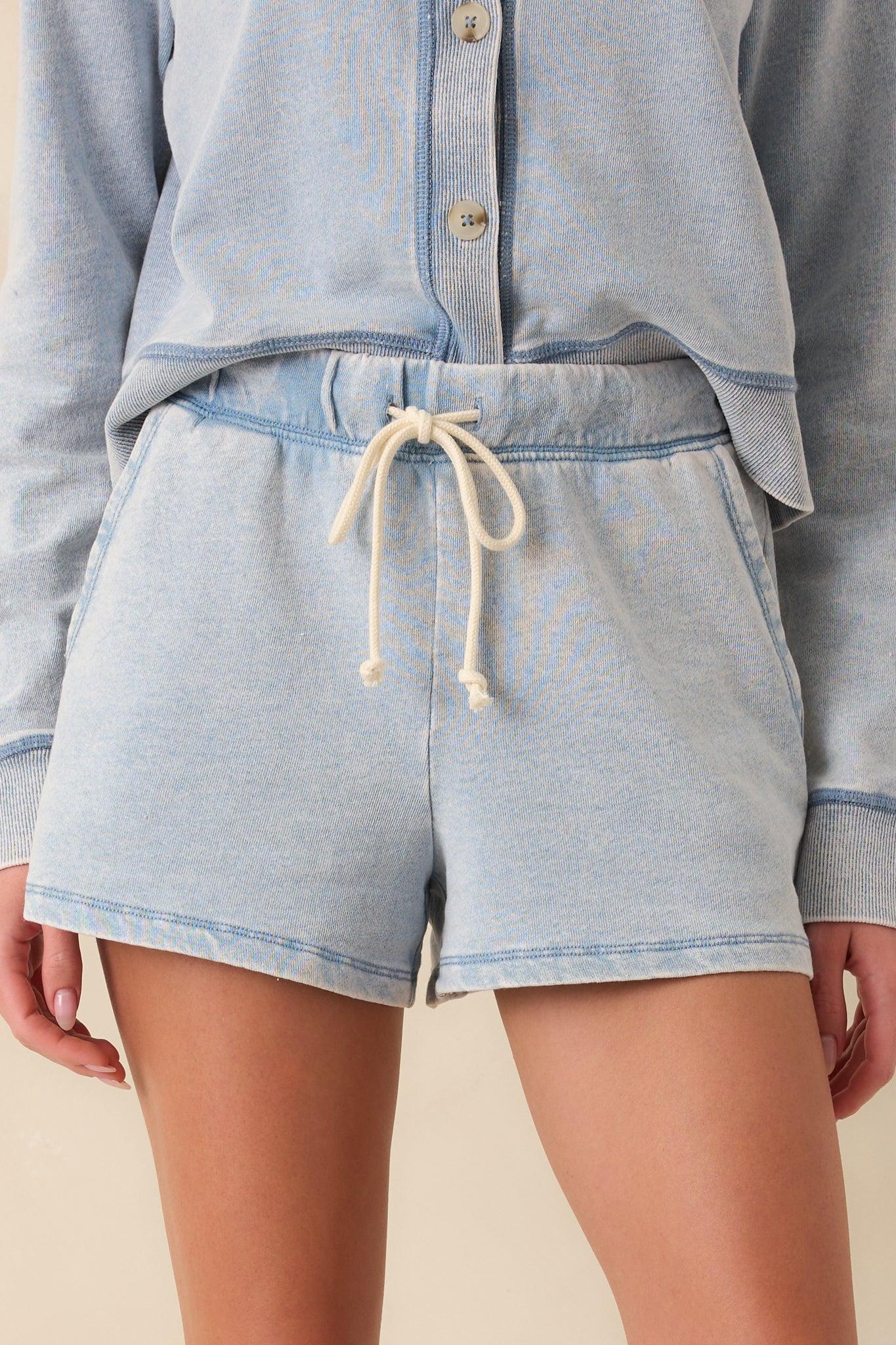 The Z Supply Light Blue Cotton Hunter Knit Denim Shorts are your answer to easygoing days that still call for a little style. Comfy, casual, and always on rotation, they’re the kind of piece you’ll wear without a second thought. These light blue shorts feature a cotton blend fabric, high rise elastic waist, adjustable self-tie ivory drawstring, and functional pockets.