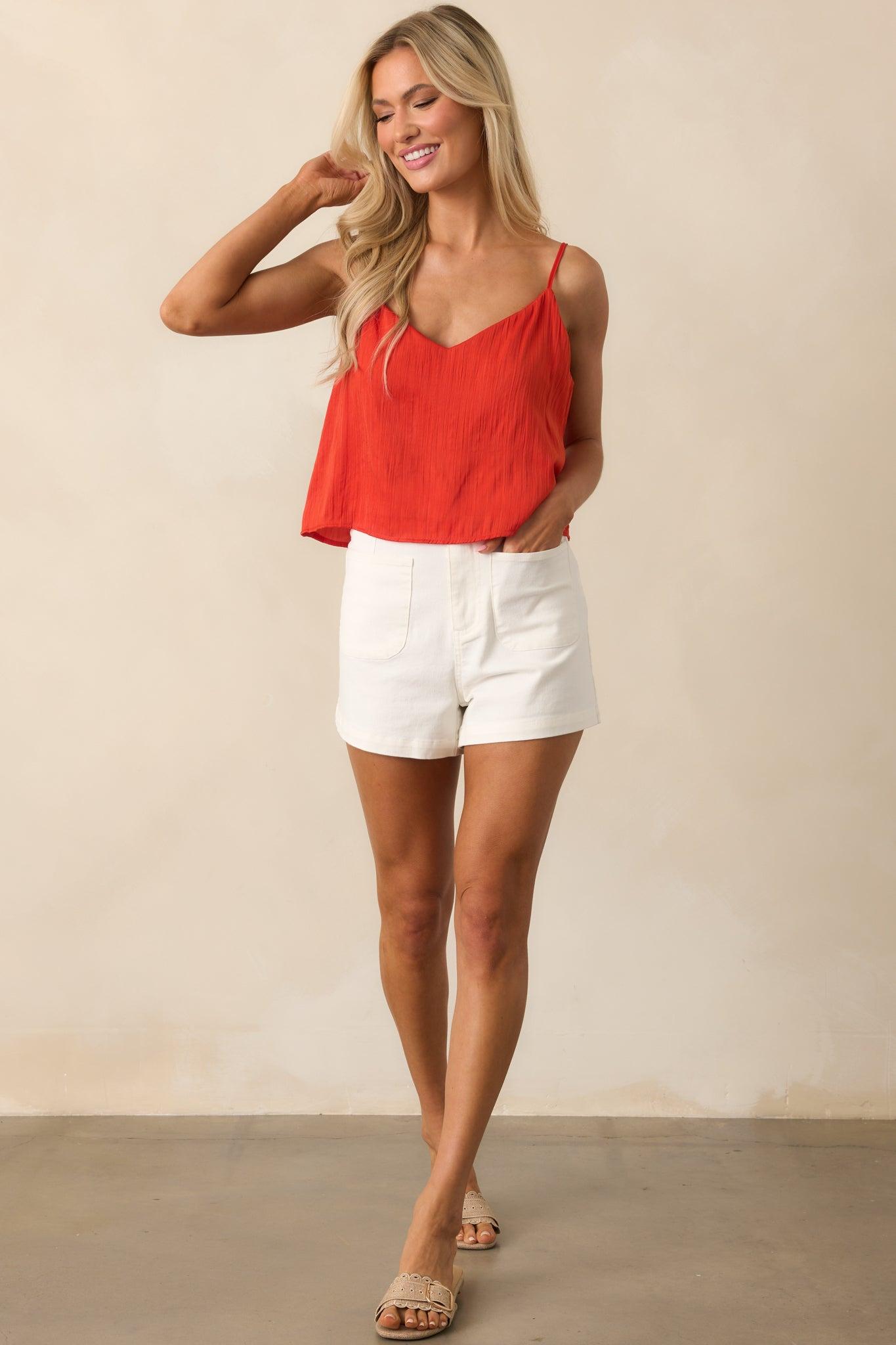 Z Supply Red Fiore Satin Crop Tank is your go-to for adding a little shine to the everyday. With a bold finish and a sleek feel, it’s made to stand out—whether you're dressing it up or keeping it casual. This red top features a textured crinkle satin fabric, v-neckline, adjustable spaghetti straps, sage green lining, and slightly relaxed fit.