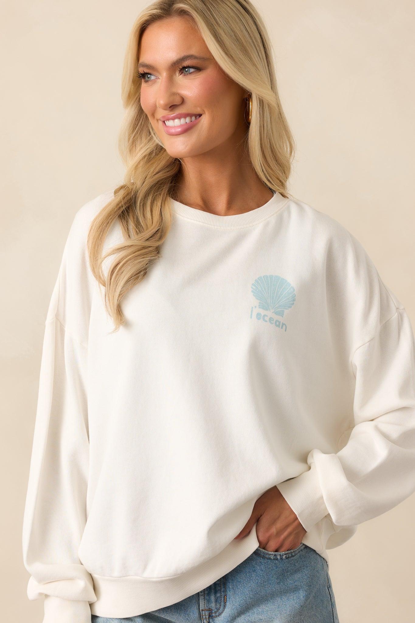 The Z Supply Sea Salt Ivory L'Ocean Sunday Sweatshirt is all about laid-back comfort with a touch of charm—just the thing for curling up, kicking back, and keeping things cozy. This sea salt ivory sweatshirt features a small seashell graphic on the upper left chest, a large ocean-inspired graphic on the back, breathable 100% cotton fabric, crew neckline, cuffed long sleeves, and a relaxed fit.