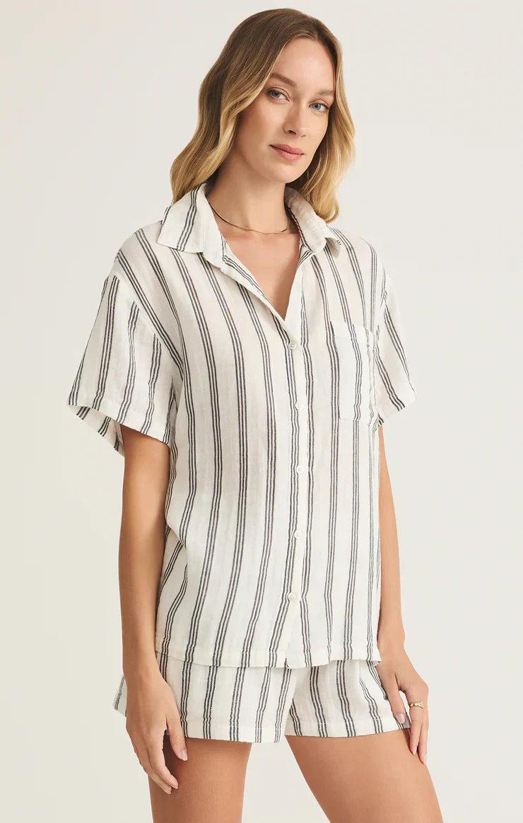 Effortlessly cool and versatile, this relaxed gauze shirt boasts a timeless button-up design, short sleeves, and a convenient chest pocket. Its lightweight fabric makes it perfect for layering over a tank or pairing with your favorite denim.