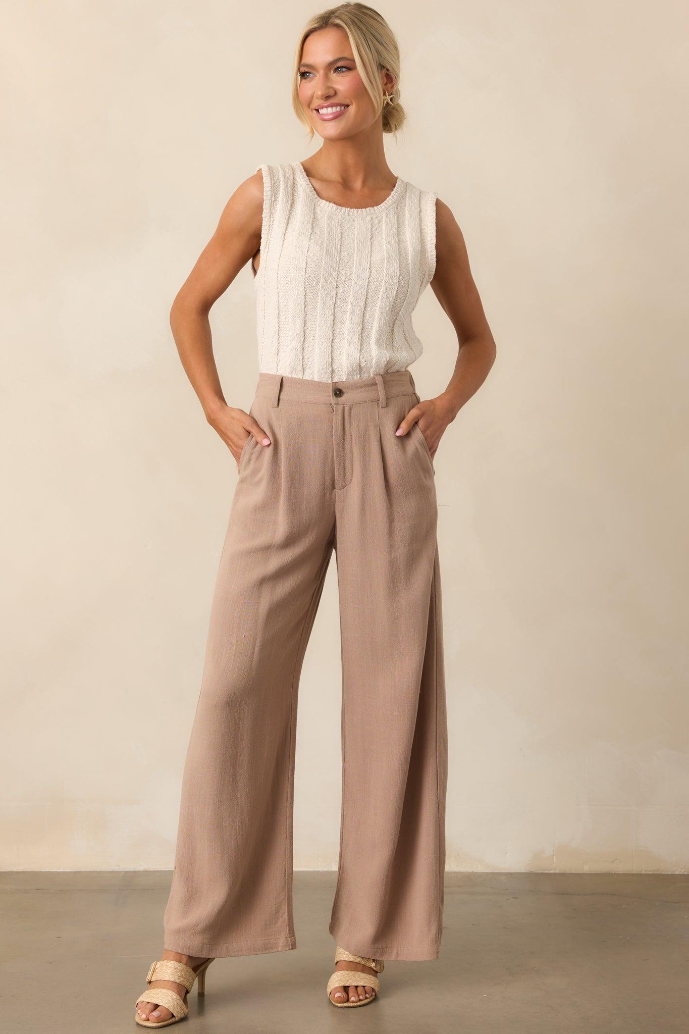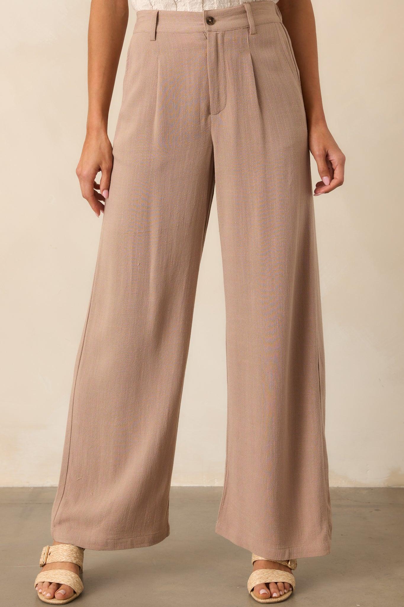Z Supply Tan Iced Coffee Vista Linen Pant is designed for effortless elegance, bringing together a relaxed vibe with a refined touch. Perfect for those days when you want to feel both comfortable and put-together. These tan iced coffee pants feature pleated wide legs, lightweight linen blend fabric, a zipper button closure, functional belt loops, elastic back waist insert, and functional pockets.