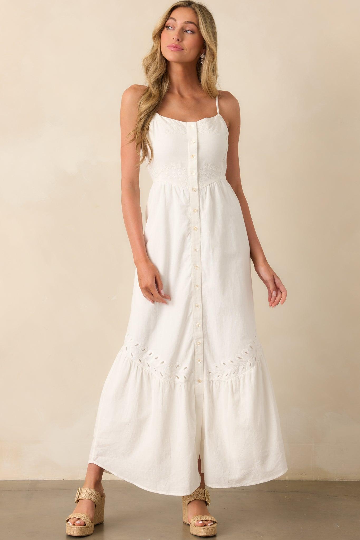The Z Supply White Citadelle Embroidered Linen Maxi Dress exudes effortless elegance and romantic charm. Perfect for any occasion, it offers a light, airy feel with a touch of refined style. This white maxi dress features a scoop neckline, adjustable spaghetti straps, a functional button front, fitted bodice, smocked back panel, white lining, and eyelet embroidered details.