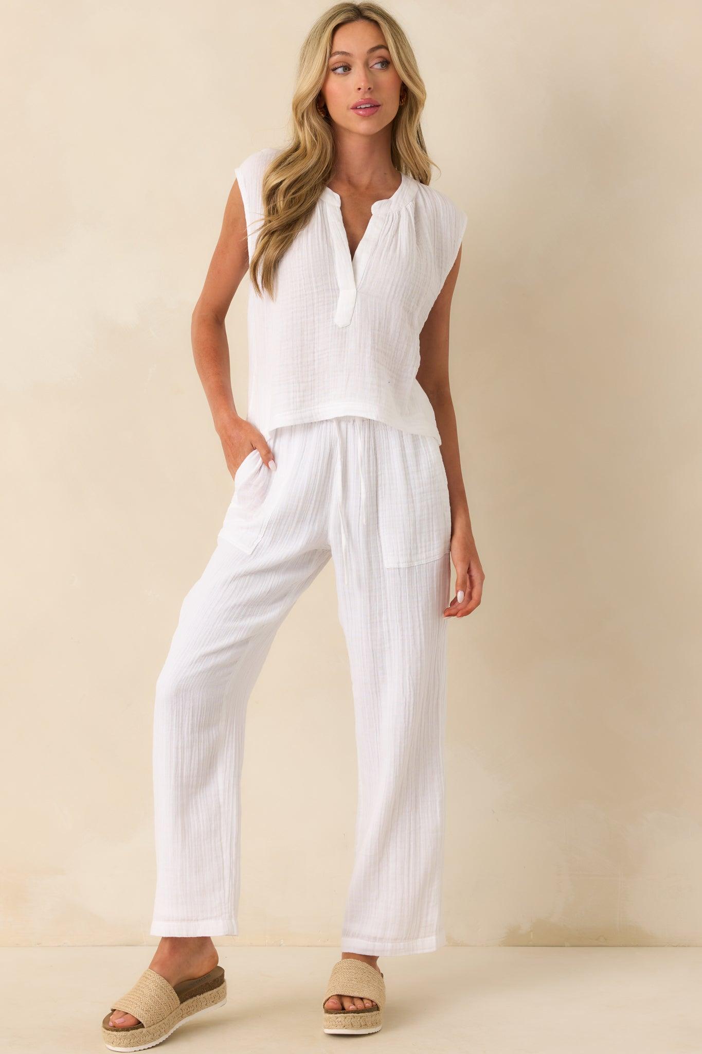 Z Supply White Cotton Cliffside V-Neck Airy Gauze Top is made for sun-soaked days and breezy moments. Light, effortless, and endlessly wearable, it’s the kind of piece that fits right in wherever warm weather takes you. This white top features a notch v-neckline, sleeveless design, lightweight 100% cotton gauze fabric, slightly cropped length, and a relaxed fit.