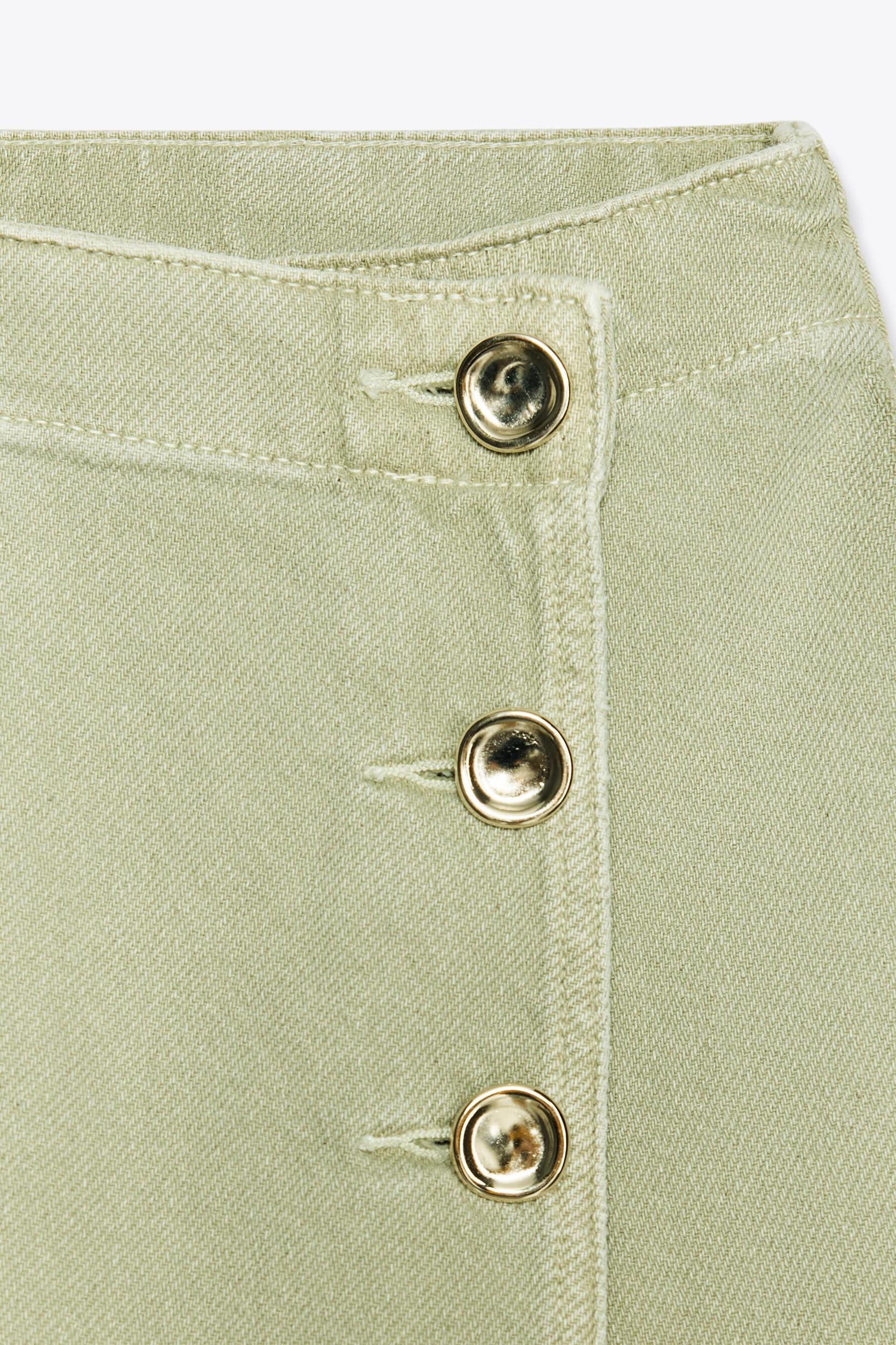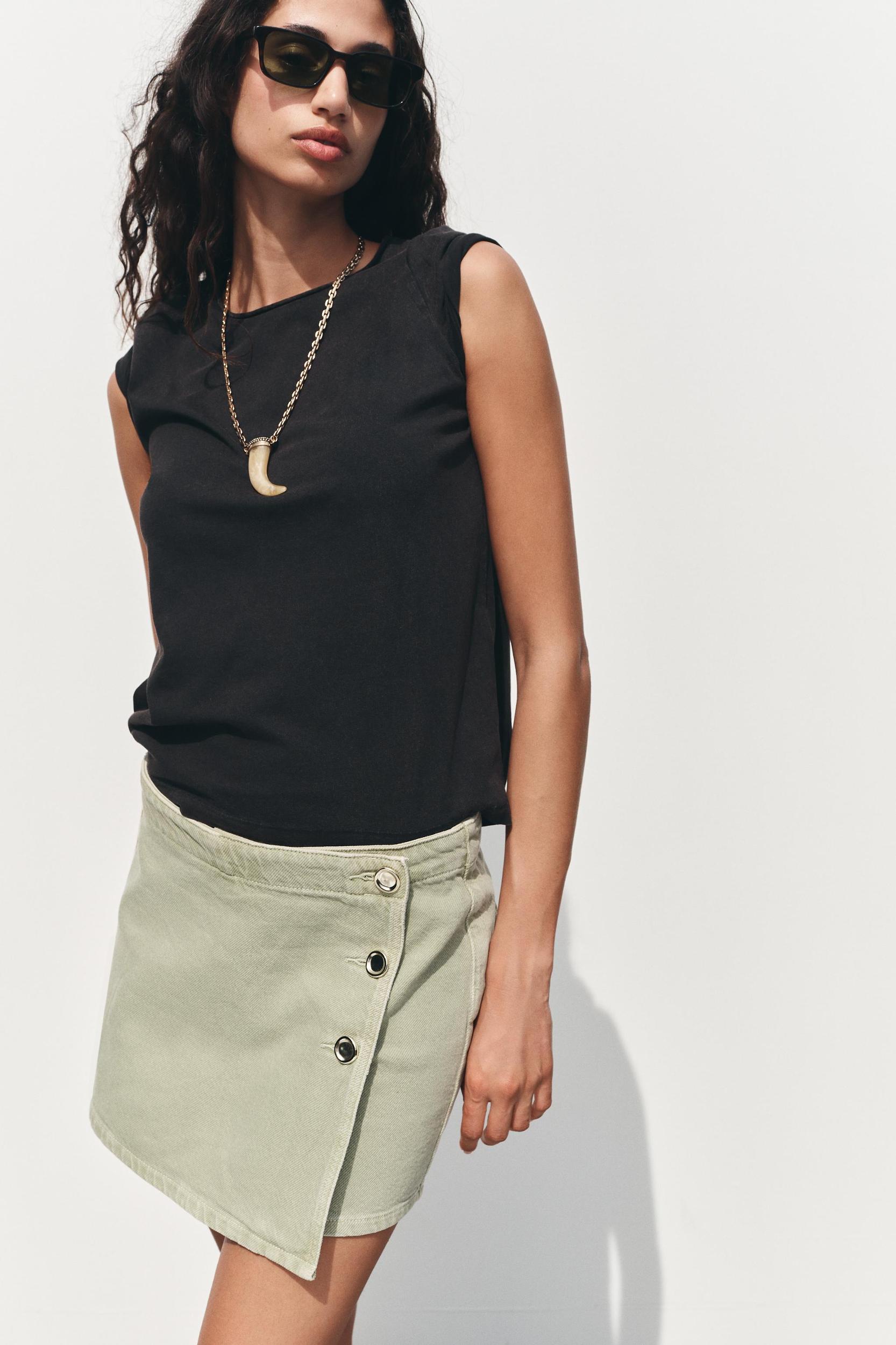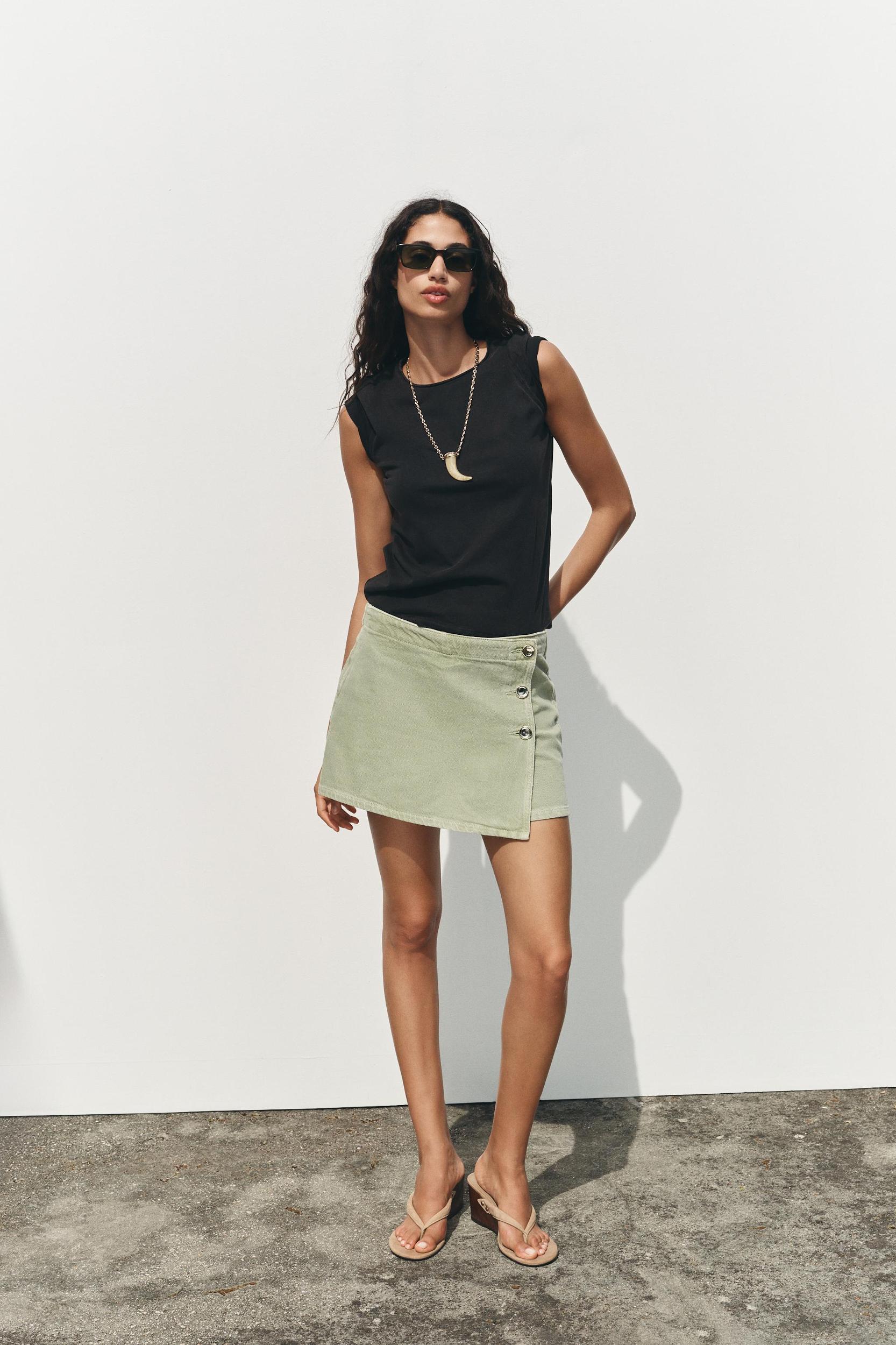 High-waisted skort with crossover front and back patch pockets. Hidden zip and button closure.