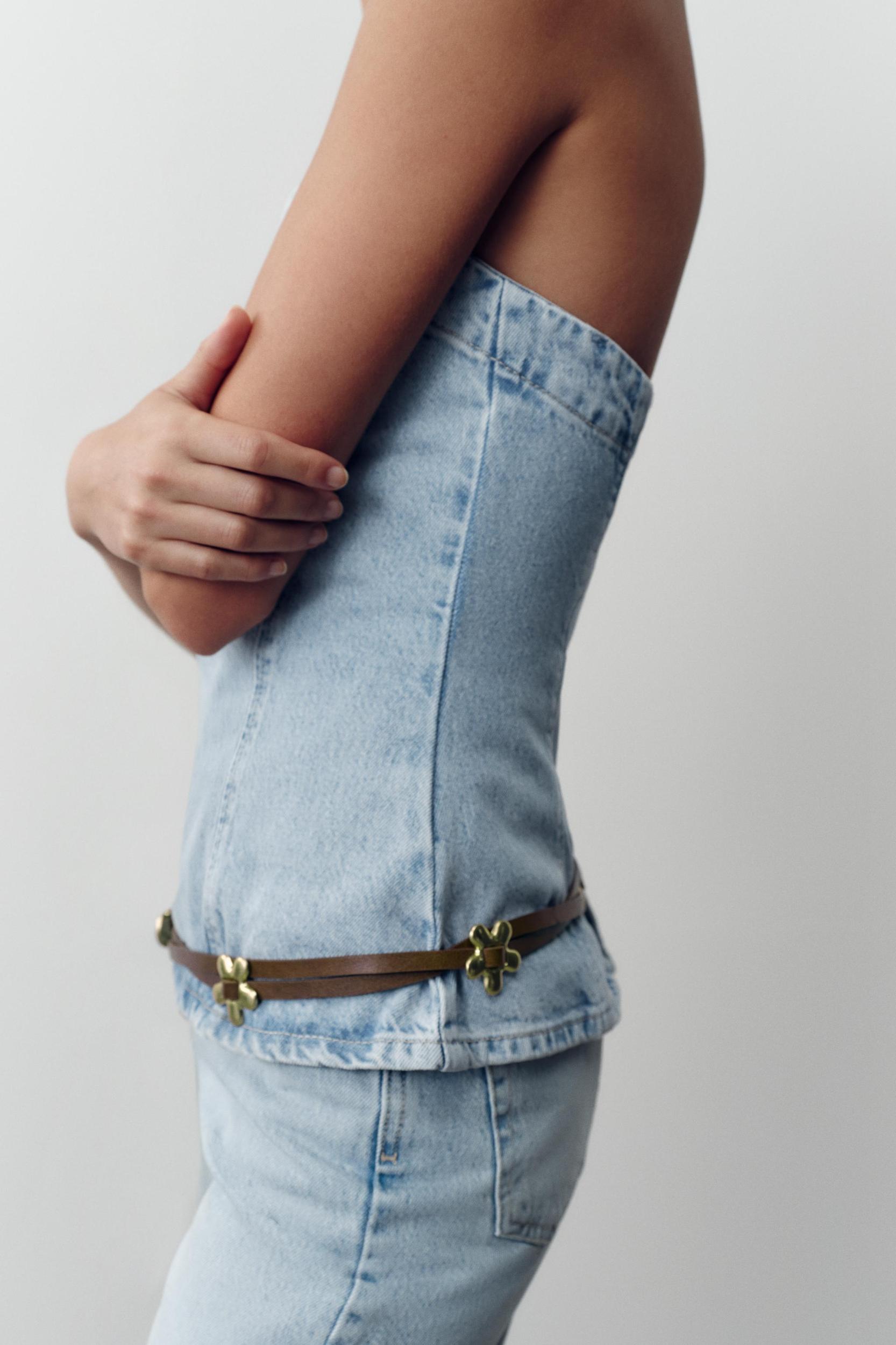 Top with a straight neckline and bare shoulders. Back zip closure.