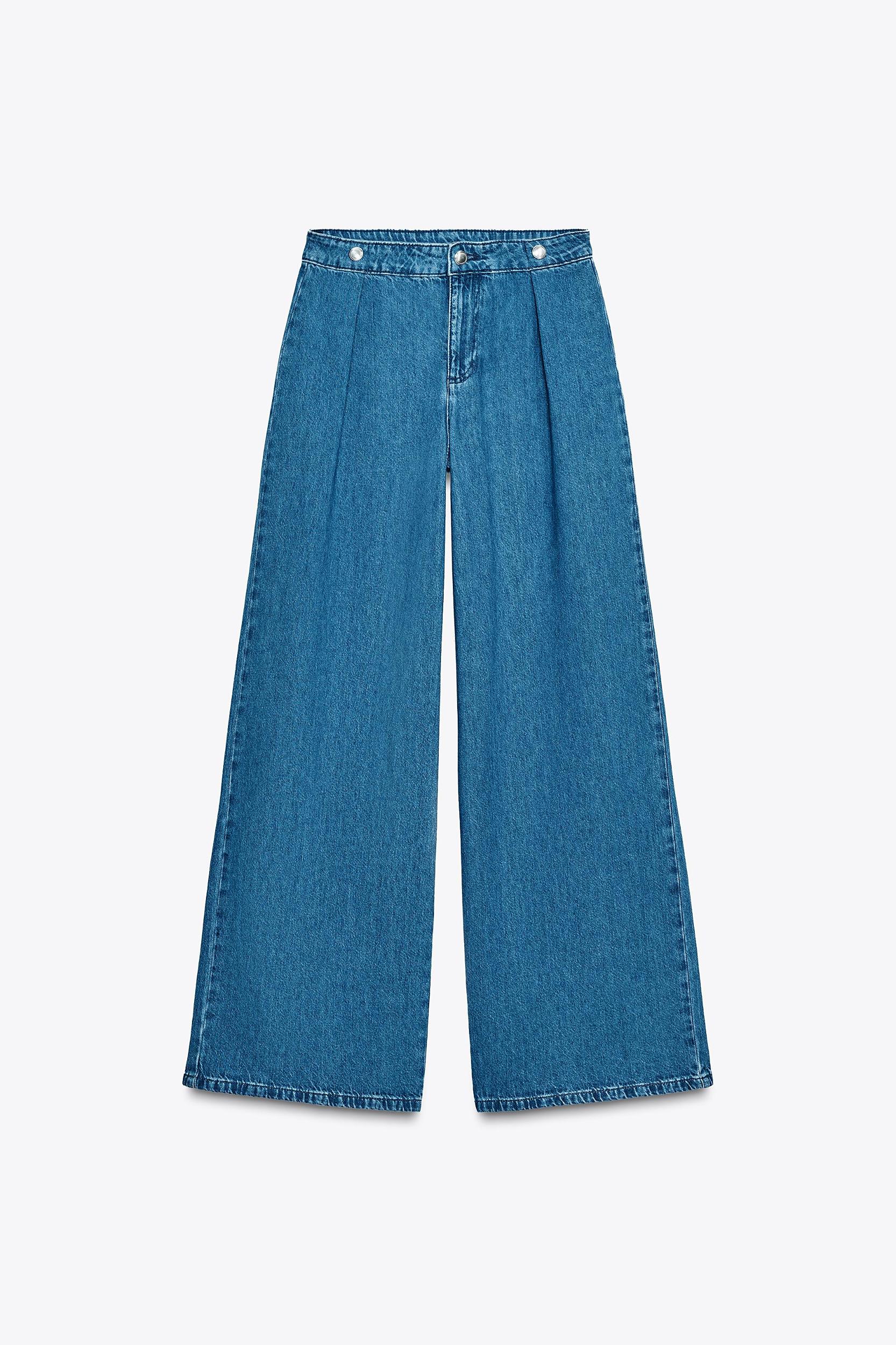 MID-RISE - WIDE LEG - PLEATS Mid-rise jeans with faux front buttons and pleats. Wide leg. Front zip and button closure.