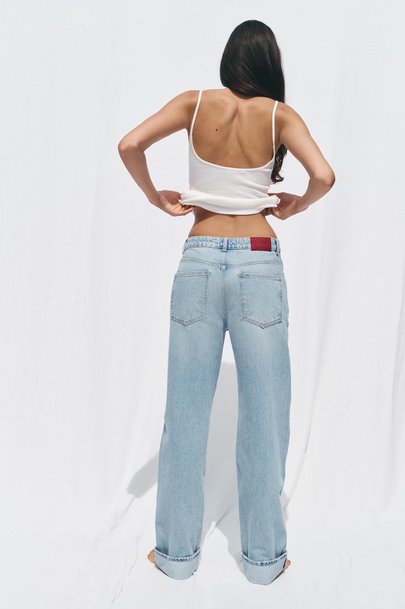 High-waisted five-pocket jeans. Straight leg with long cuffed hem. Wraparound front zip, inside button, and metal button closure.