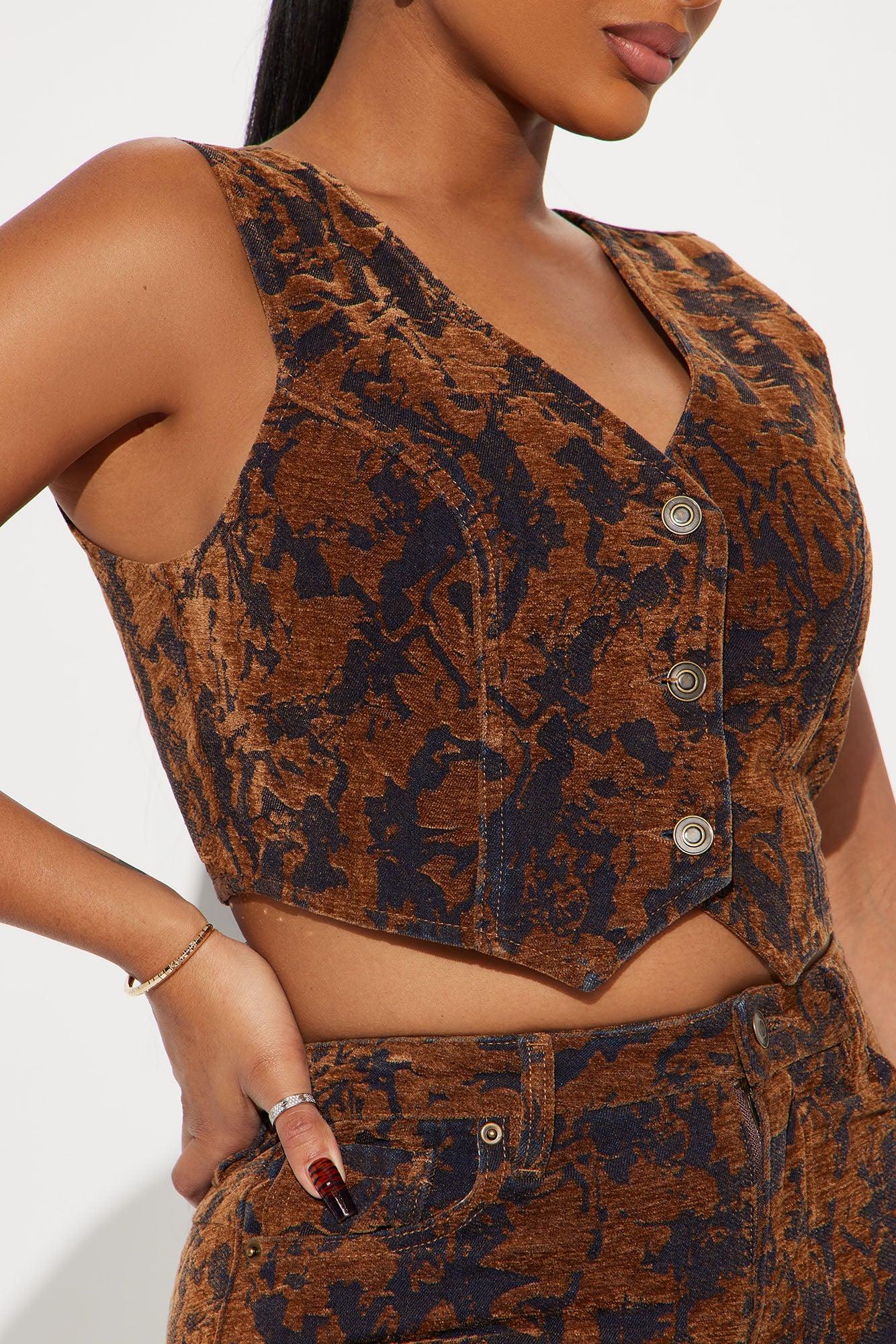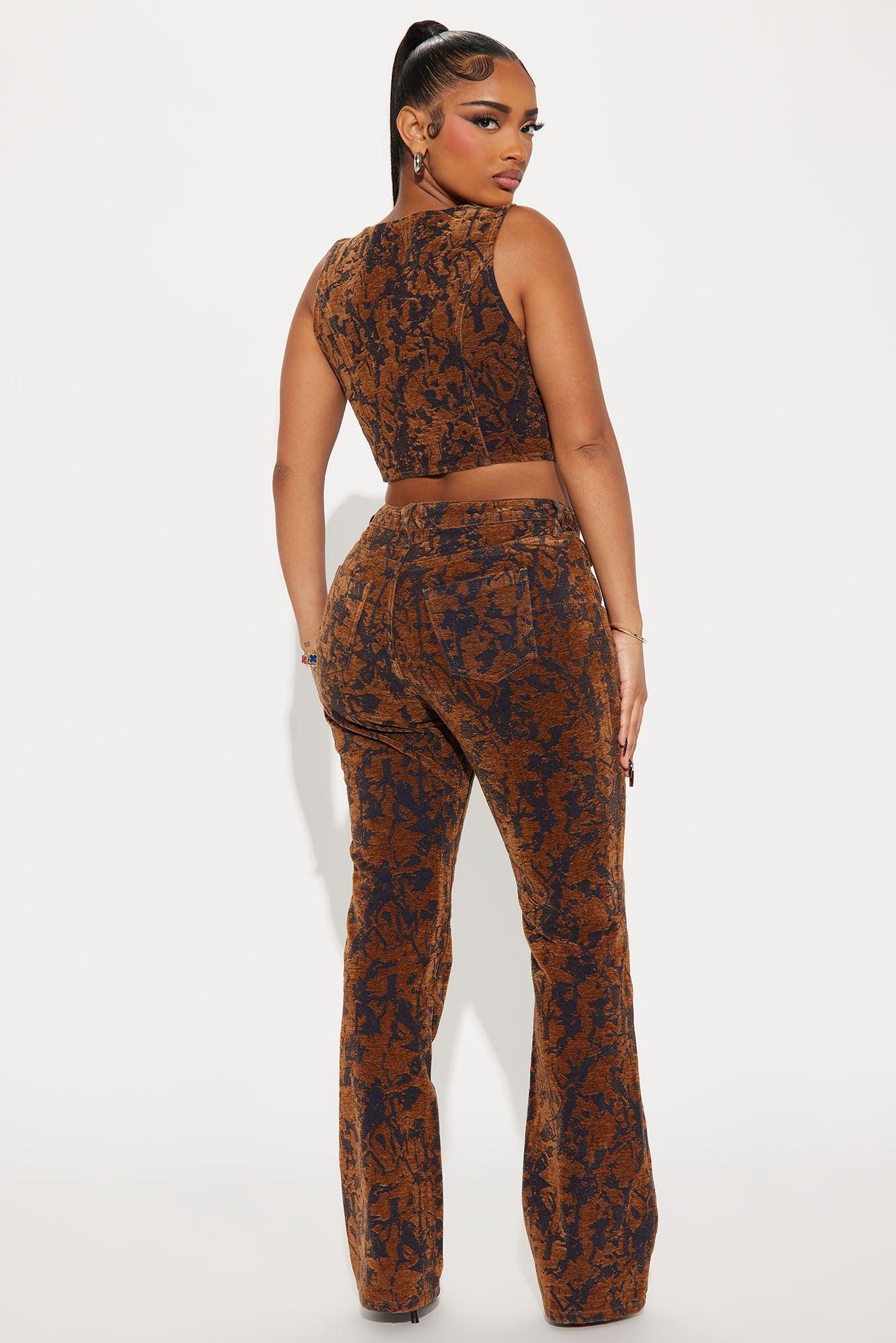 Available In Brown Combo. Velvet Pant Set Button Front Vest Straight Leg Pant Button And Zipper Closure Front And Back Pockets Stretch 33.5" Inseam Disclaimer: Placement Of Burnout Will Vary 93% Tencel 7% Linen Imported California Proposition 65 WARNING: Cancer and Reproductive Harm - www.P65Warnings.ca.gov.