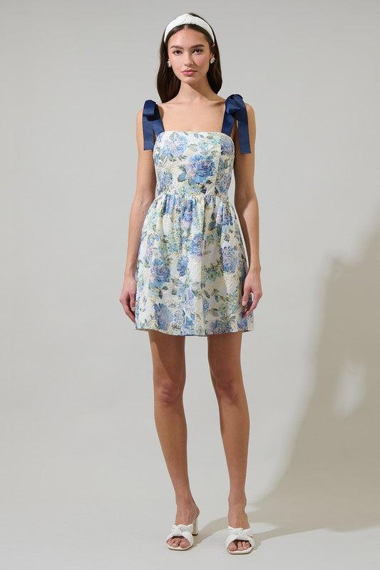 Whether you're attending a garden party or brunch with friends, this mini dress if the perfect one. Blue and white eyelet florals designs this mini dress with tying straps lead to a straight neckline with a smocked back. The bottom skirt has a flare effect. Add on white heels to go along. - Tie strap - Mini - Smocking back - Floral - Color: White Blue Size + Fit - Model is 5'9 and wearing size XS - Measurements taken from size S - Chest: 16 3/4" - Length: 27 1/2"