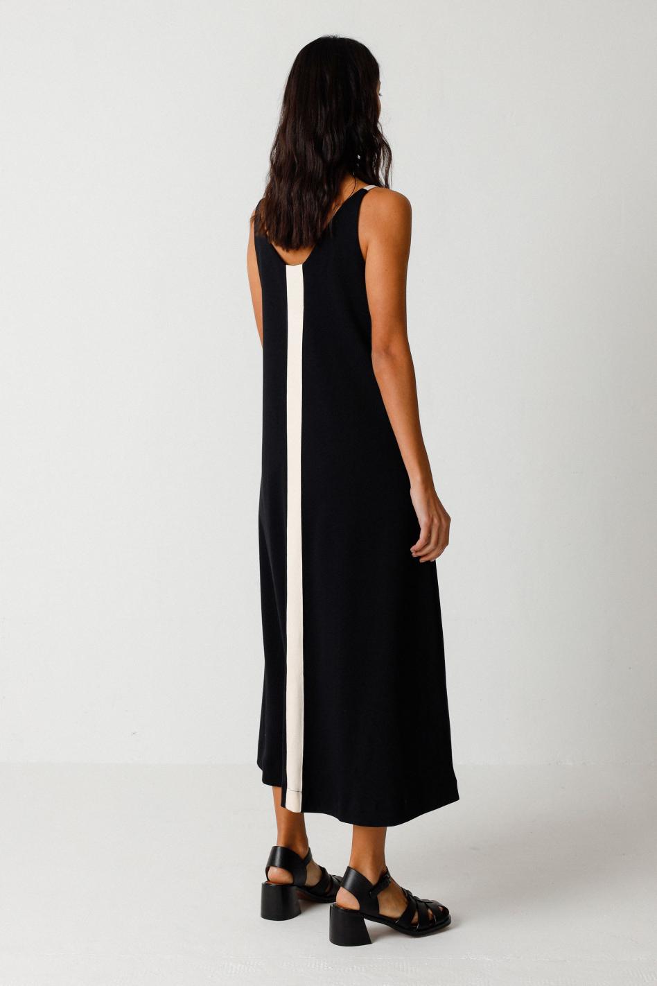 GOTS certified organic cotton knit strap dress. This style has a midi length with an A line. A slit on the front and a contrasting pannel on the front and back add an elegant touch. Black. Made in INDIA