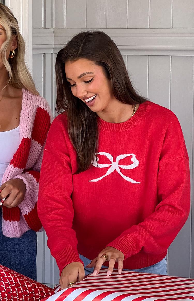 Red Bow Graphic Knitted JumperHow to style:Add a playful pop to your winter wardrobe with our Zami Red Bow Sweater featuring a charming white bow graphic. This cosy yet stylish piece is perfect for layering or wearing on its own, bringing a touch of fun to your everyday look. Pair it with jeans or a skirt for a effortless outfit that’s sure to make a statement!Features: Full length Crew neckline White bow graphic Ribbed neckline, sleeve cuffs and hem Lots of stretch Mid weight knit material Size up for an oversized fit