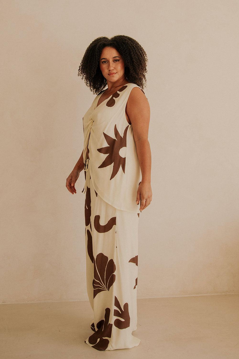 A luxe set that can be mixed and matched! The Zana Top is made from a high quality zipper crepe fabric with our exclusive Galene print. It is a relaxed style featuring a twist detail at bust, split at centre front and longline hem. Get the set with the Zana Pants or change it up with the Simone Skirt! Designed exclusively by Sabo.