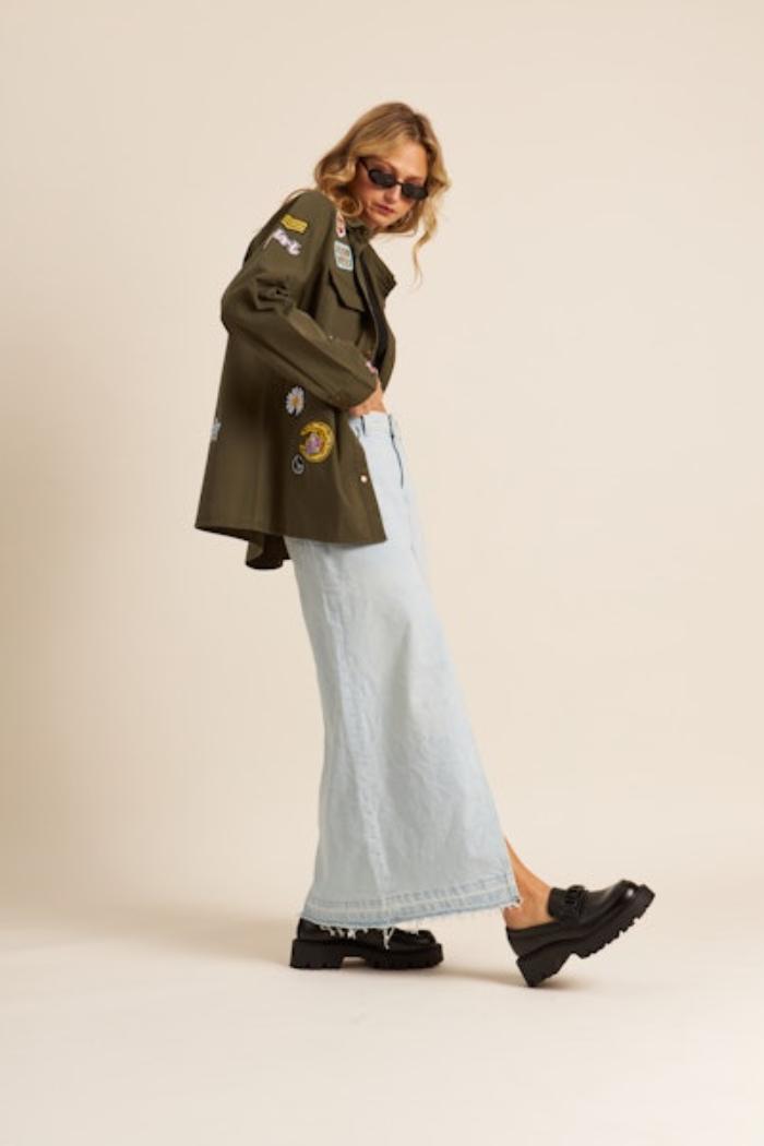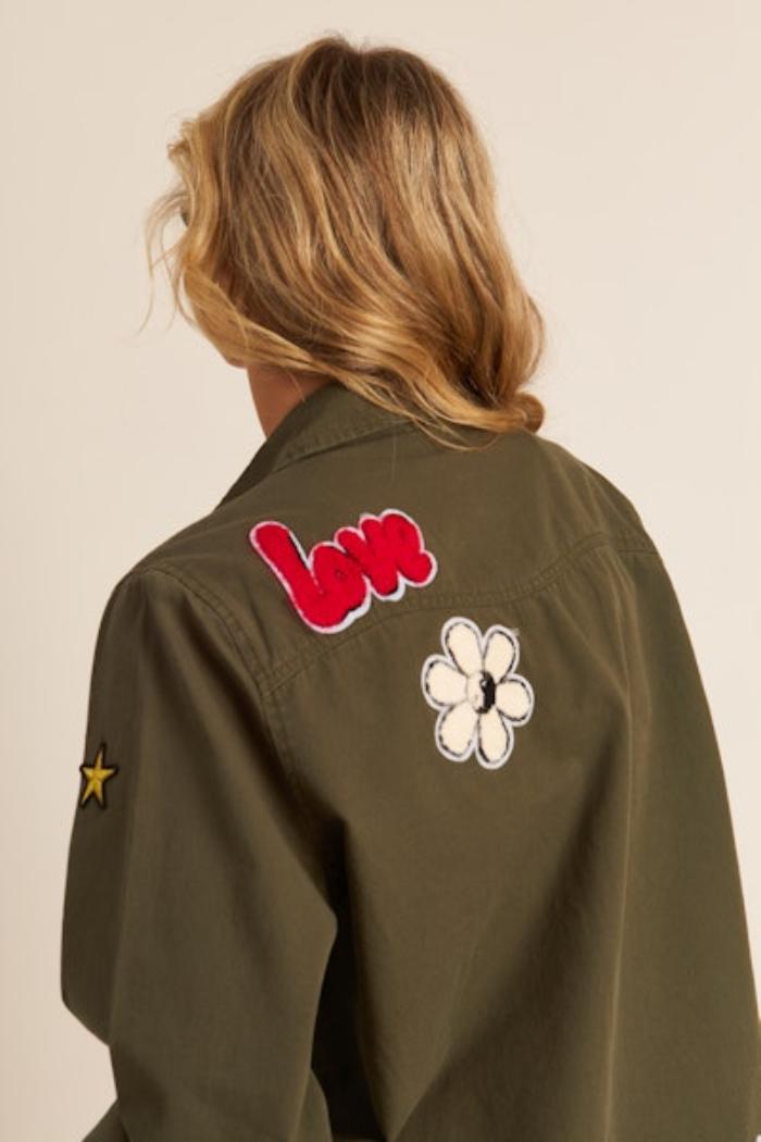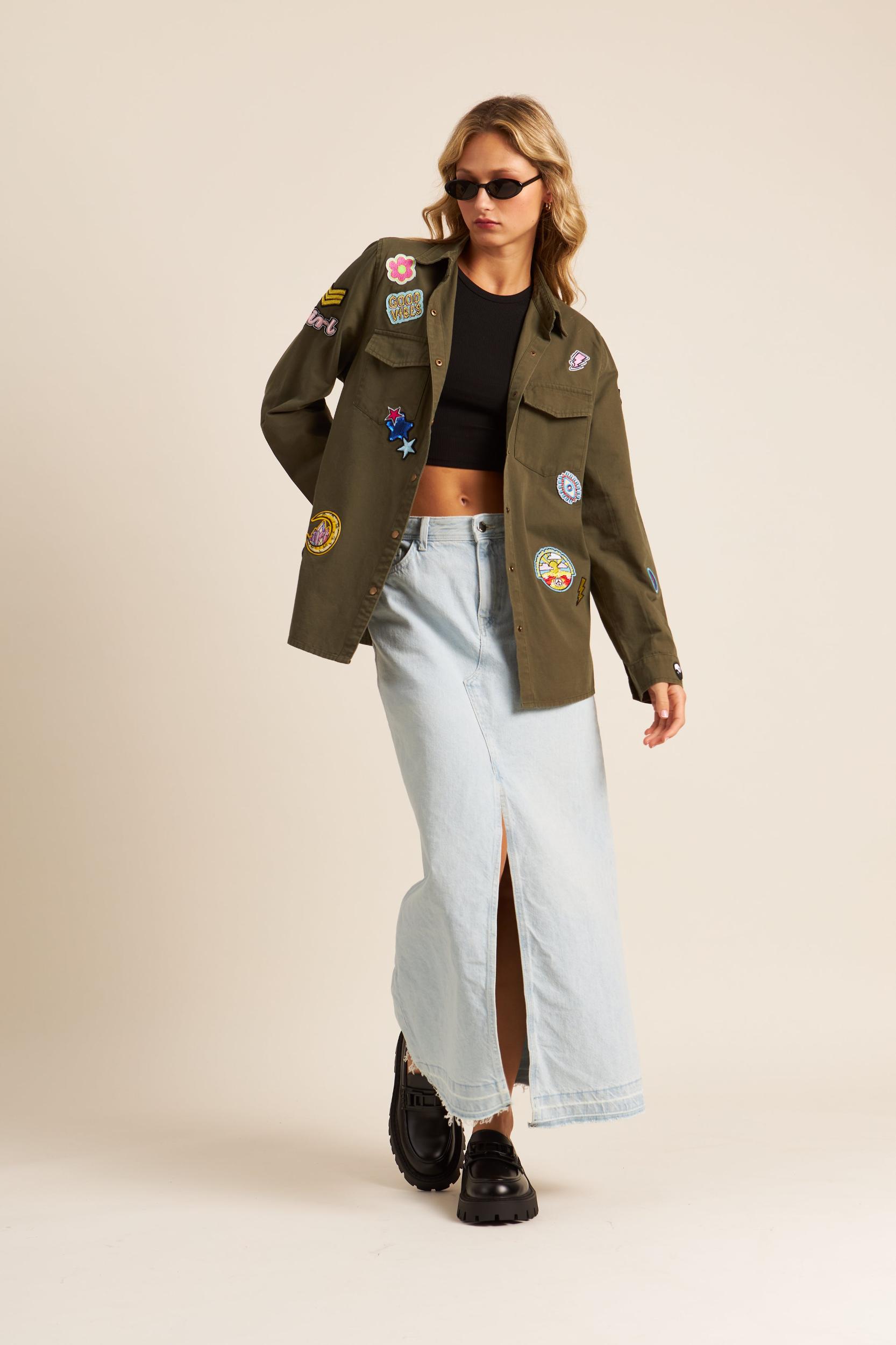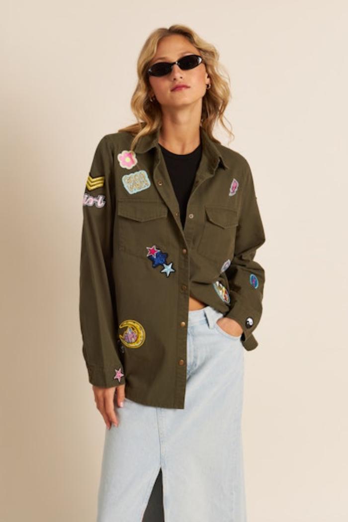 This military-inspired olive green jacket is a playful twist on a classic utility style, adorned with a variety of colorful and quirky appliqués. Patches ranging from stars and planets to whimsical expressions infuse a sense of fun, while the jacket retains a structured look with its pointed collar, button-down front, and chest pockets. The roomy fit makes it a versatile layering piece that pairs effortlessly with casual outfits.