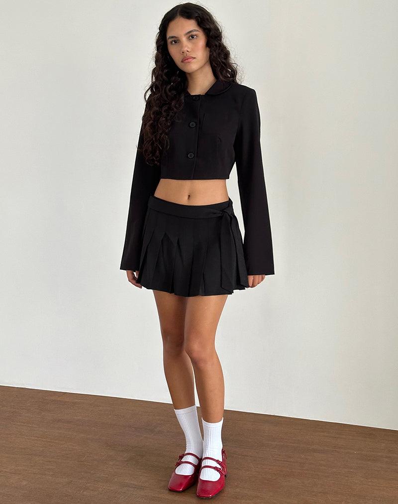 In black the Zaviya jacket features tailored fit with cropped length and collared neckline. Complete with long sleeves and three button fasting down front with patch pockets. We love to style with our Zekira Skirt for the perfect co ord. MODEL WEARS SIZE:EXTRA SMALL - MODEL HEIGHT:5'7