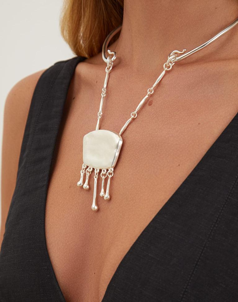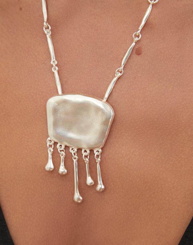 The ViX Zaya Collar is a gorgeous dangling choker style necklace that drapes over the décolletage. It’s a bold piece of jewelry to have and treasure forever. Pair the Zaya Collar with your favorite tops and dresses featuring deep necklines for an elegant and sultry look. Features: Natural hammered effects Silver-plate
