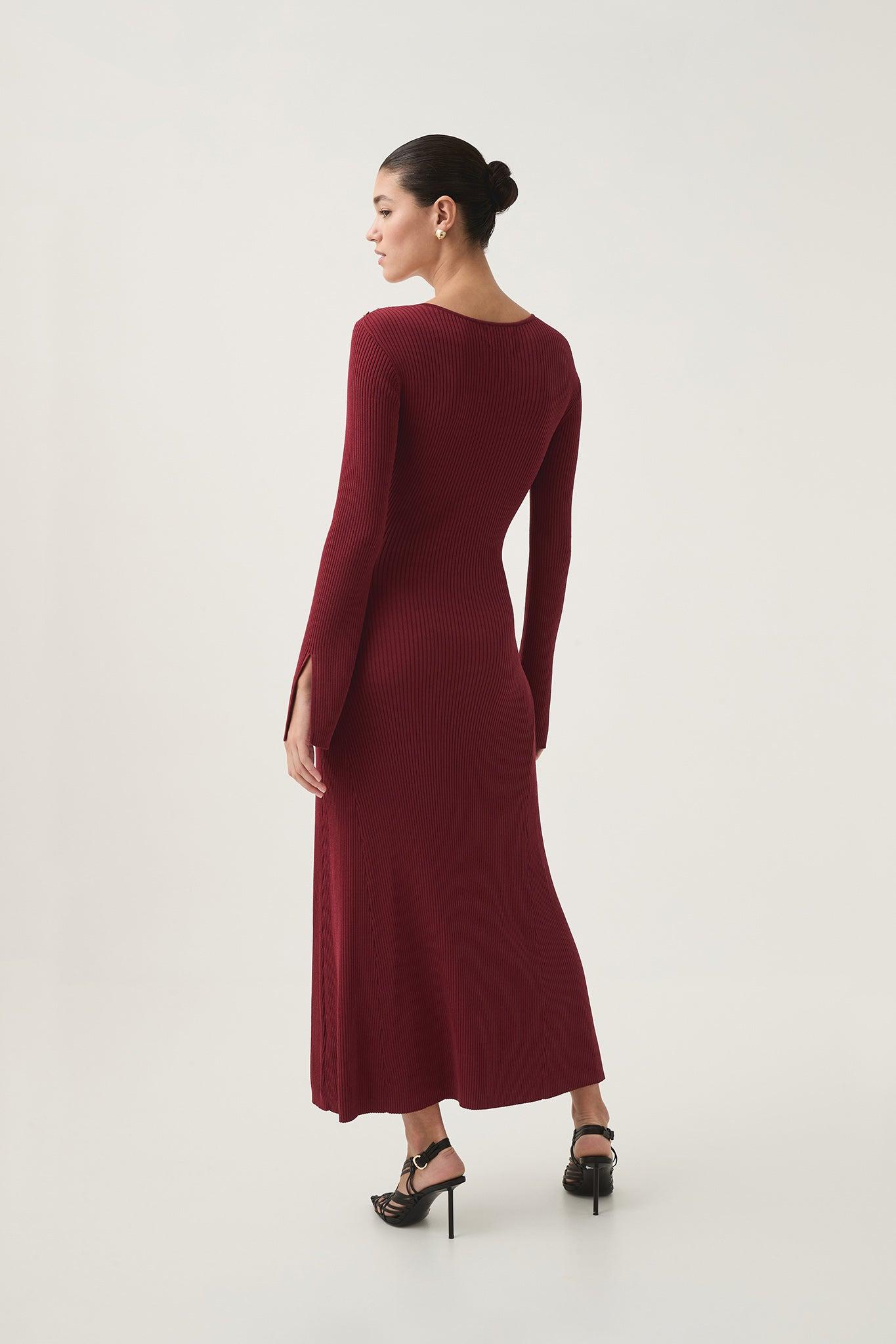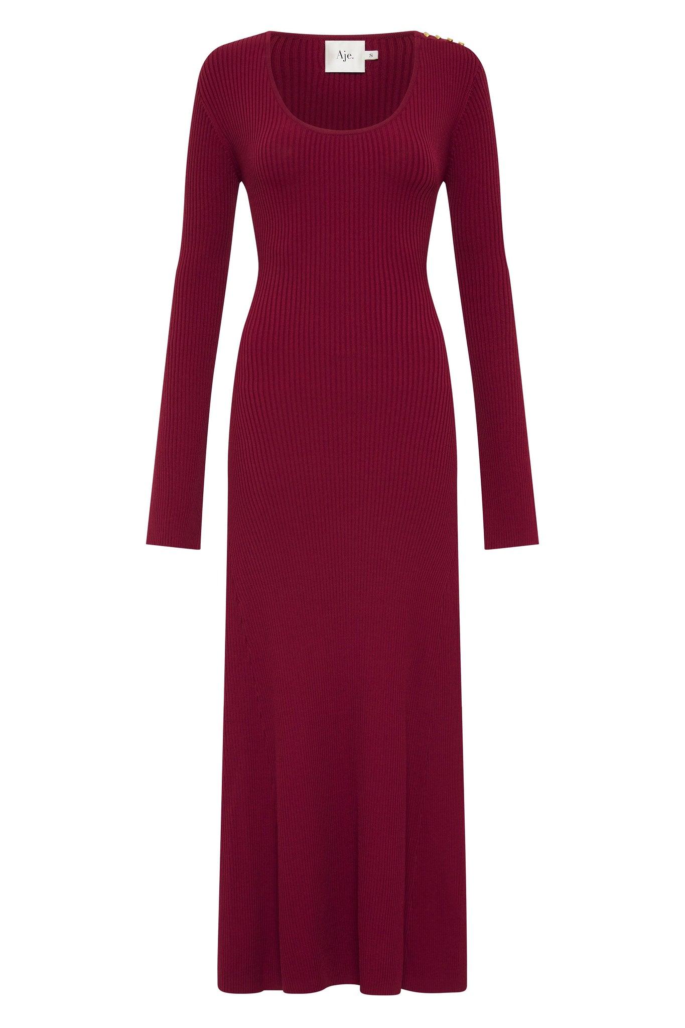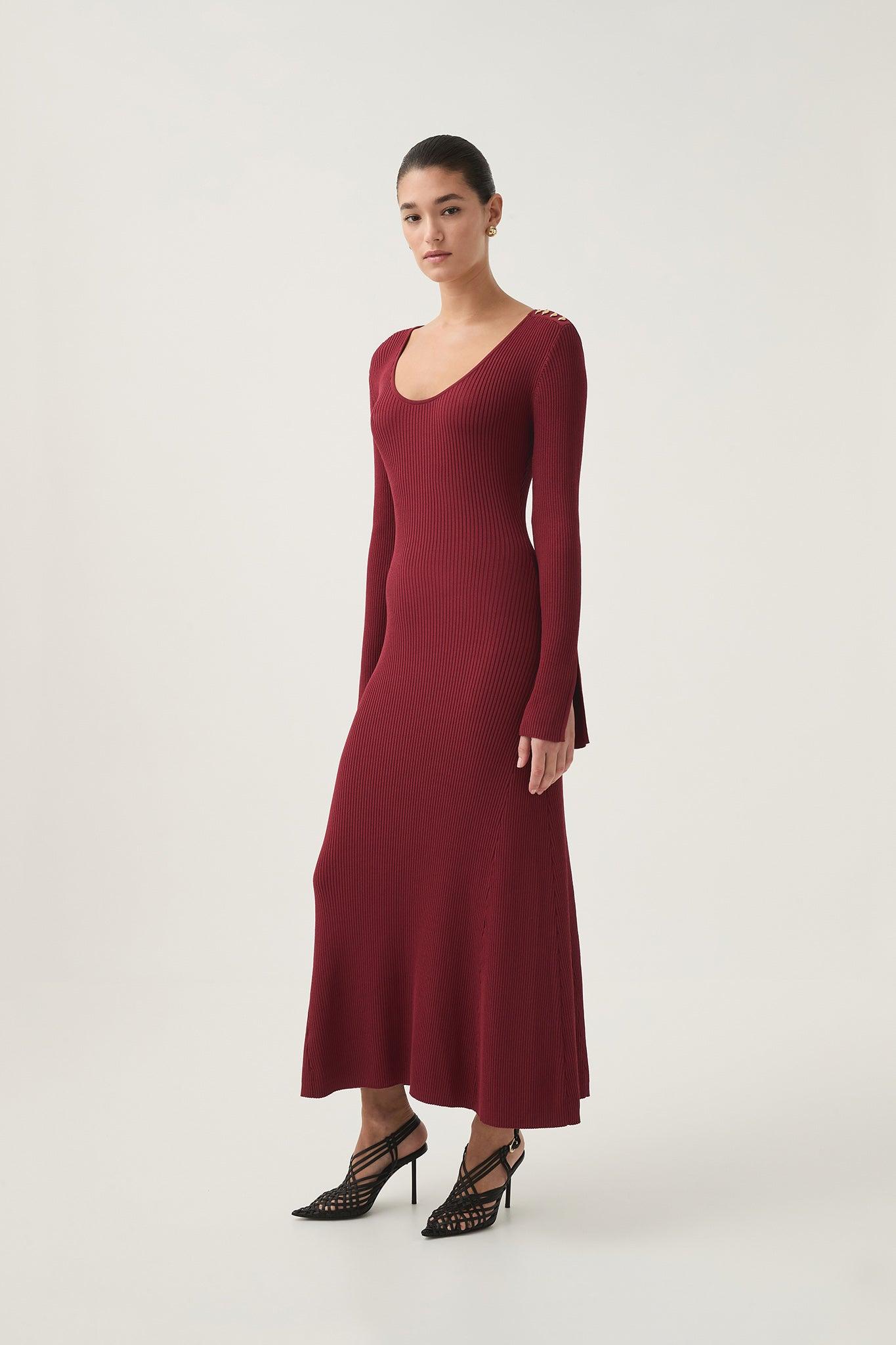 PRODUCT DETAILS Women's knit midi dress Ribbed detail throughout Scoop neckline Fit-and-flare silhouette Gold accent button at left shoulder Long sleeves with split seam Shop All Dresses SIZE AND FIT Model wears a size 8/S Model: 177cm/ 5'10 Bust: 80cm Waist: 58cm Hips: 88cm FABRICATION 65% VISCOSE 35% NYLON