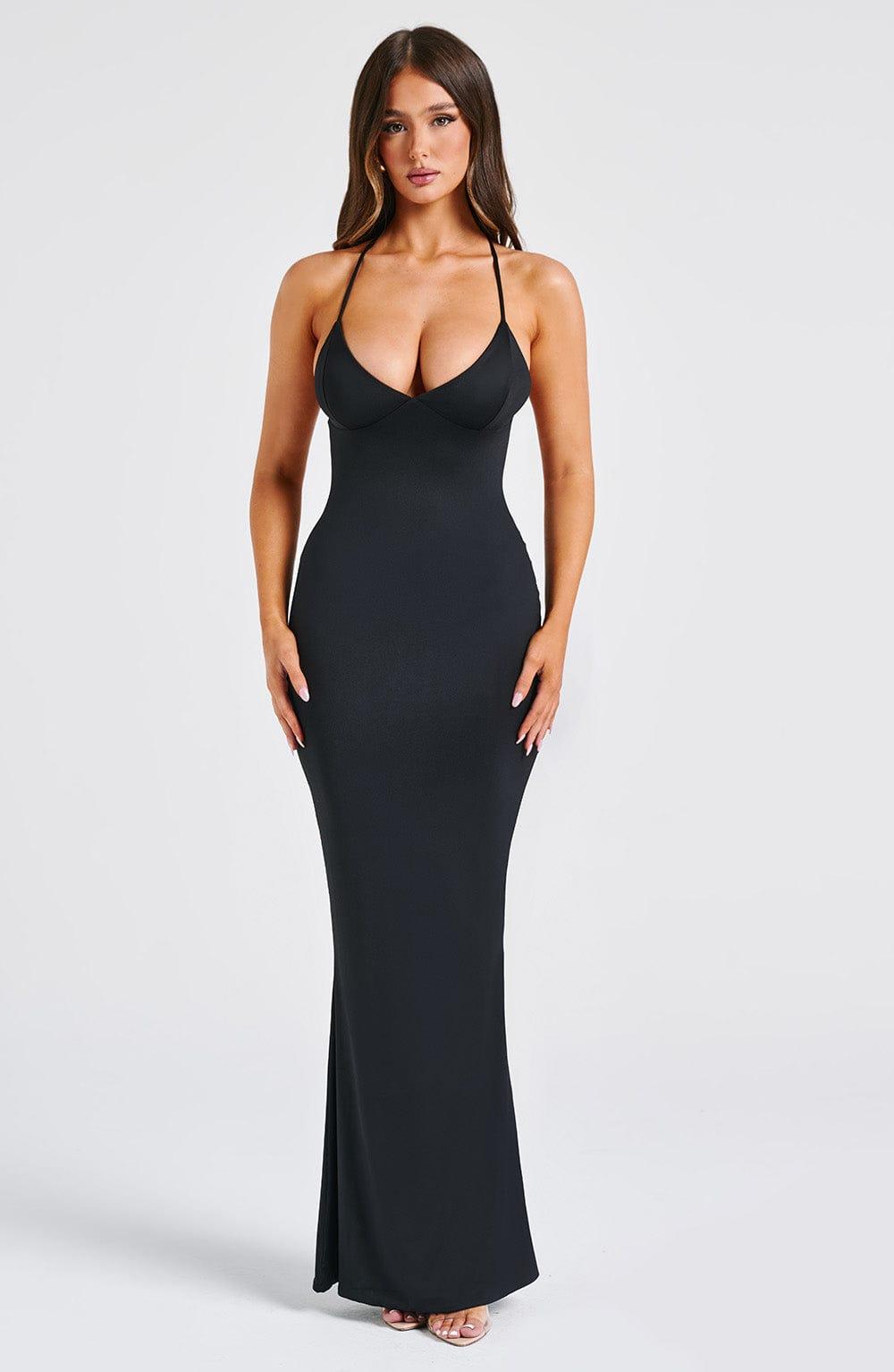 Introducing Zelda, the dress to RSVP 'yes' in. The super slinky, stretchy fabric feels like a second skin, moulding to your curves for the silhouette of dreams. The maxi design is complete with flared skirt hem, triangle cups, cross over straps and a showstopping low v-shape back with ruched detail on the bum. Colour: Black. Luxury double slinky jersey. Fit and flare silhouette. Adjustable straps. Triangle shape cups. Crossover straps on back. Super low v-shape back. Ruched detail on bum. Maxi length. Model is an XS and is wearing an XS. Model is an F-cup size.