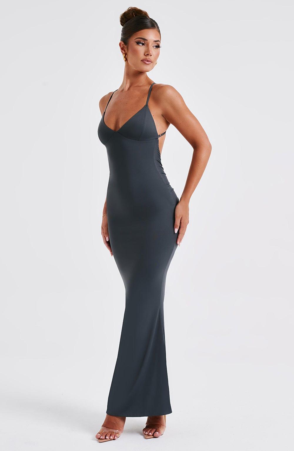Introducing Zelda, the dress to RSVP 'yes' in. The super slinky, stretchy fabric feels like a second skin, moulding to your curves for the silhouette of dreams. The maxi design is complete with flared skirt hem, triangle cups, cross over straps and a showstopping low v-shape back with ruched detail on the bum. Colour: Charcoal. Luxury double slinky jersey. Fit and flare silhouette. Adjustable straps. Triangle shape cups. Crossover straps on back. Super low v-shape back. Ruched detail on bum. Maxi length. Model is an XS and is wearing an XS.