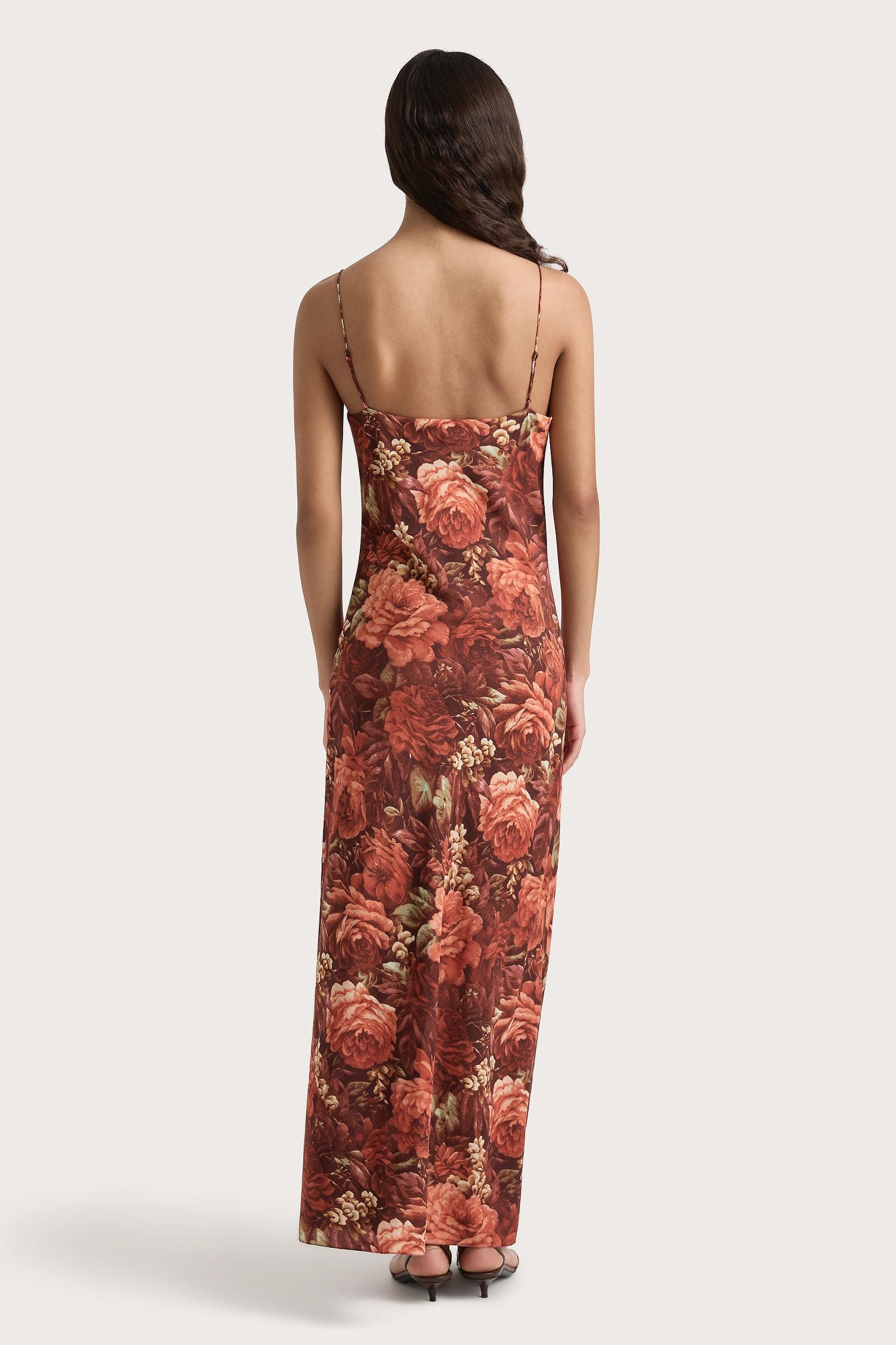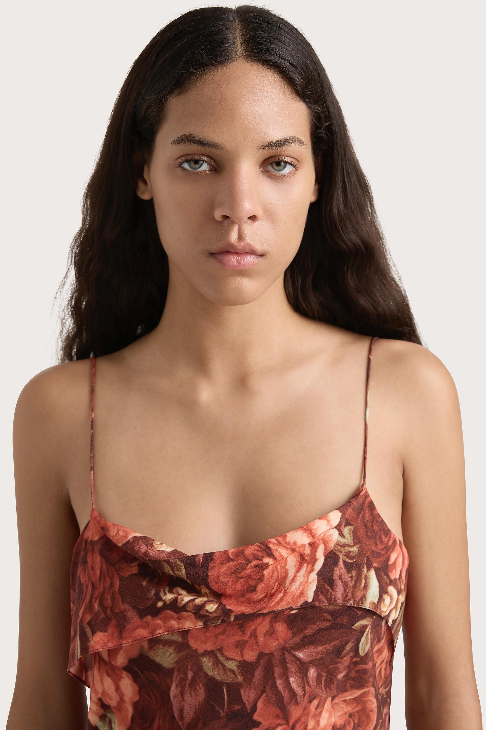 A romantic ankle-grazing midi dress with thin straps, adjustable in length, and a cowl neckline with asymmetrical draping across the front. It is a slip-style silhouette with a bias cut and slight A-line skirt that falls around the ankles. Designed from a luxurious 100% silk in a nostalgic soft red rose print, inspired by 1940s references, style with a simple heel for elegant occasionwear. This style is true to size. Please note there is no elastic woven into the fabric so it does not offer any additional stretch.