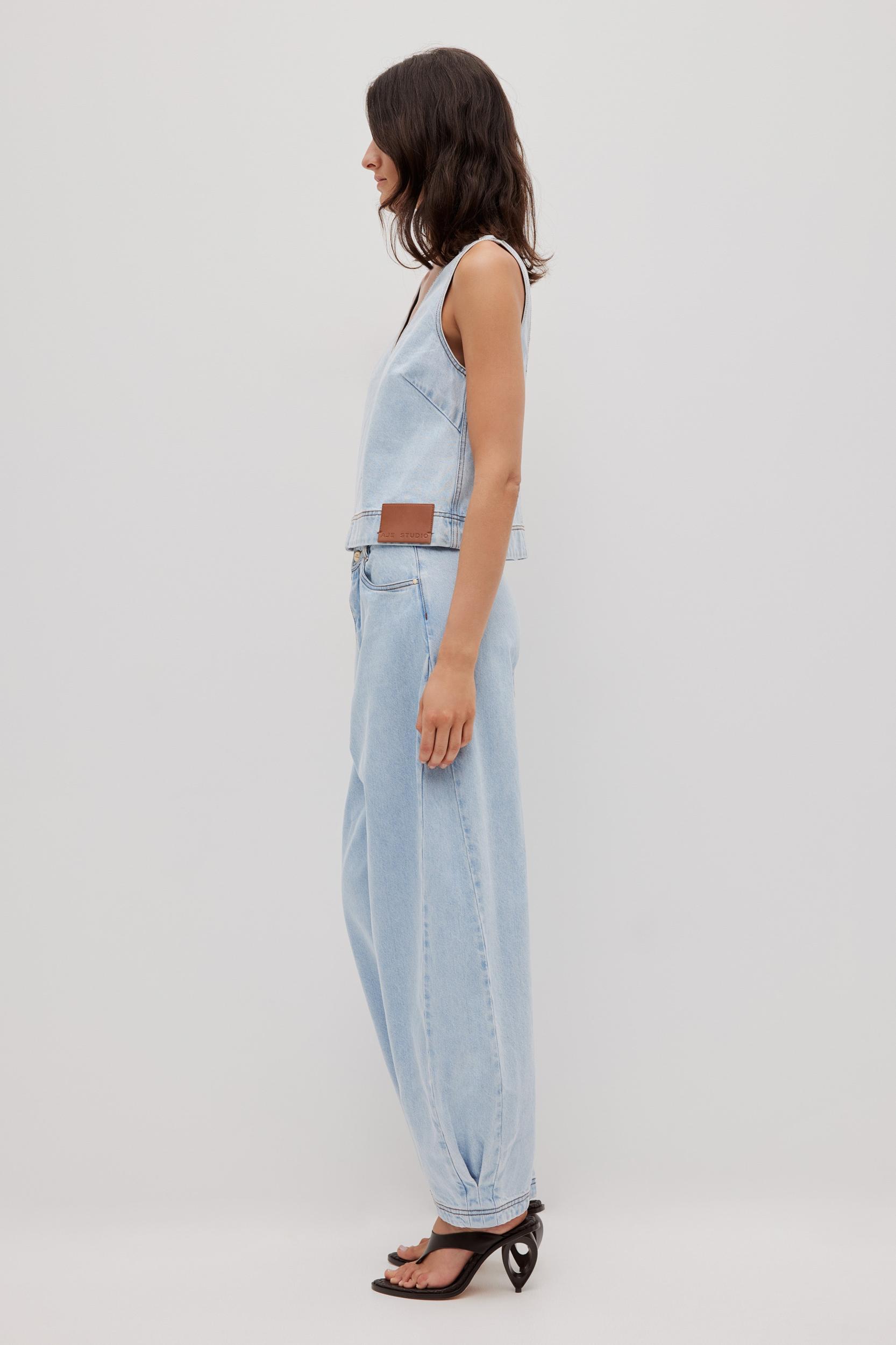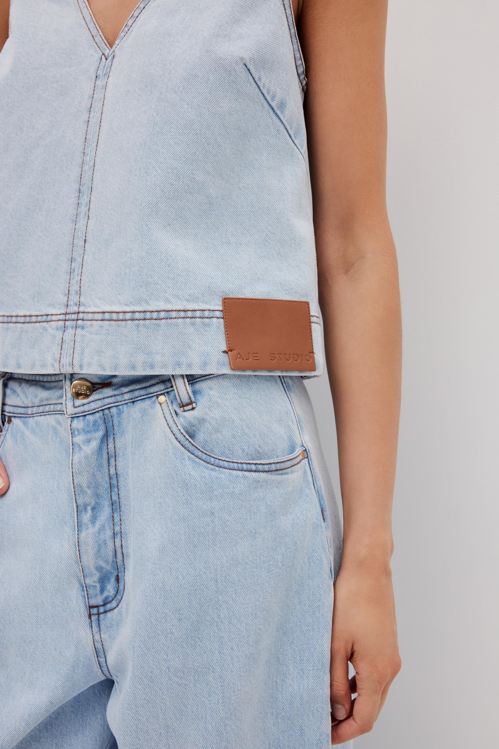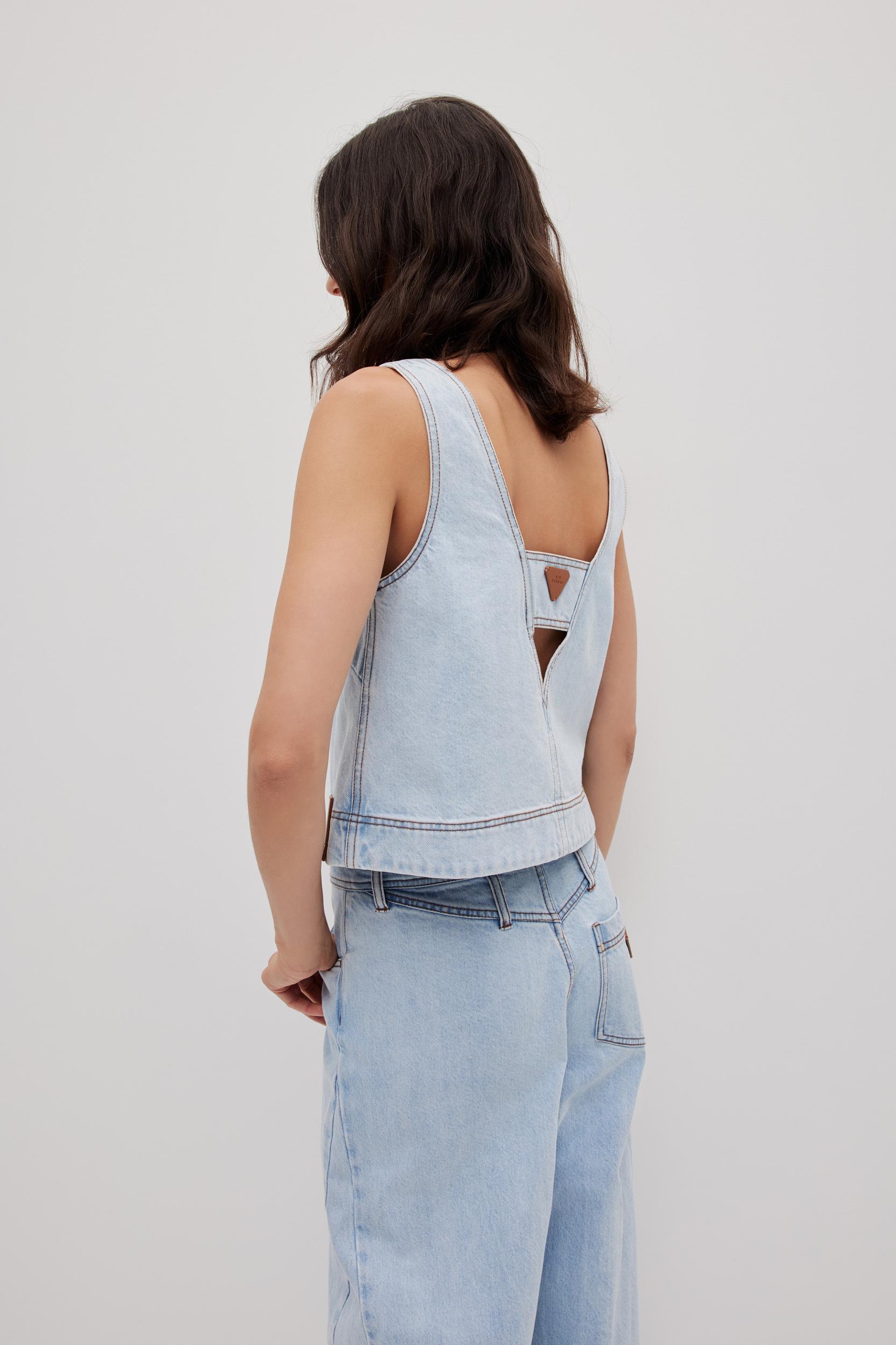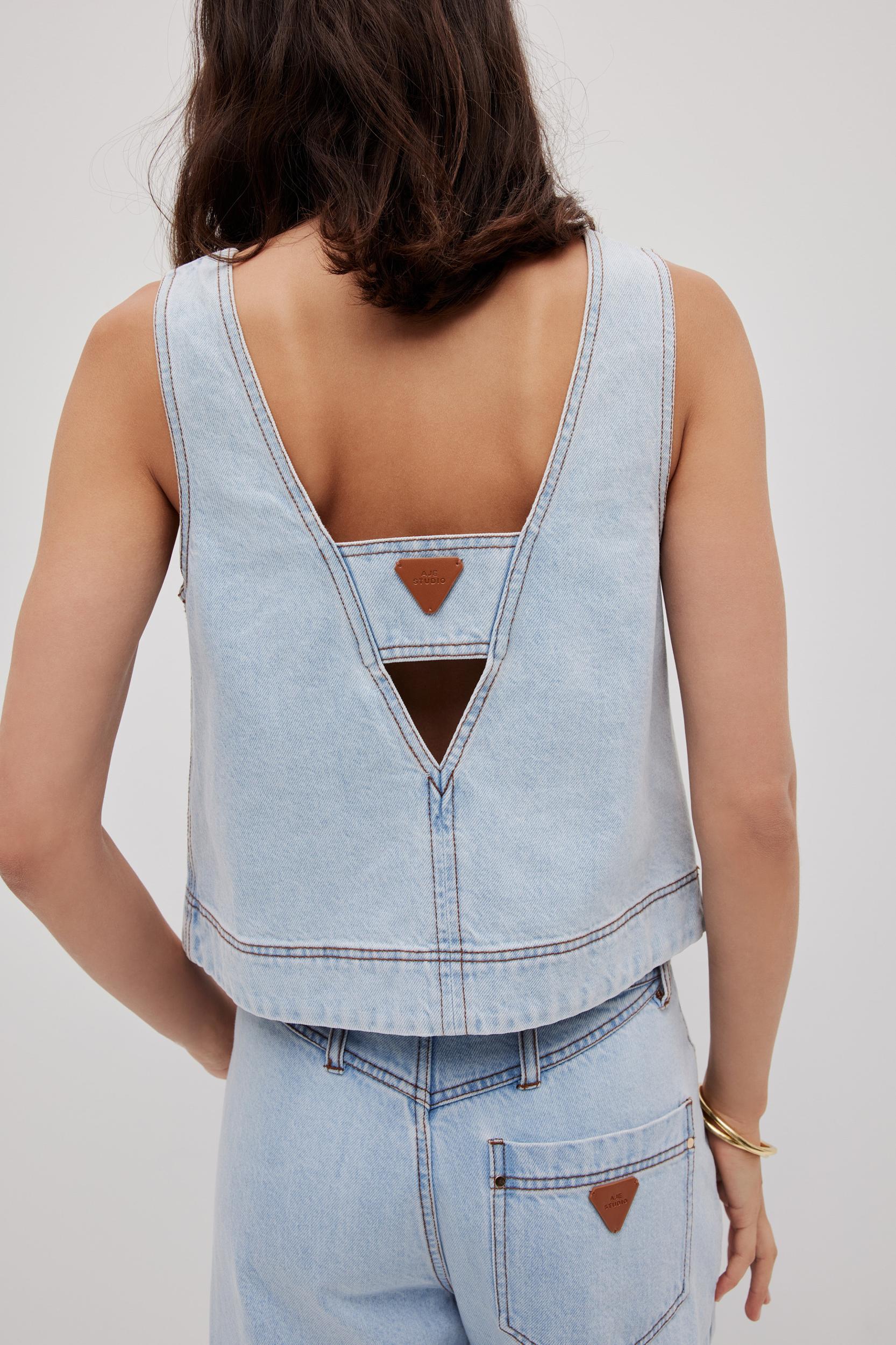 PRODUCT DETAILS Denim top Boxy fit Deep v-neckline at front and back Signature back panel with logo Embossed vegan leather logo patch at hem + back panel Slip on style Unlined style 100% Cotton Dry Clean Only Shop All Tops SIZE AND FIT Model wears a size 8/S Model: 179cm/ 5’10 Bust: 82cm Waist: 64cm Hips: 88cm