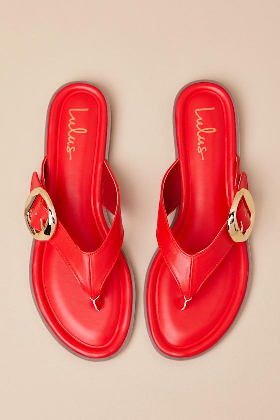 In summary, these effortless sandals will quickly become this season's staple look, with their smooth, faux leather construction and easy slide-on design. The wide, thong-style upper boasts a light-catching, gold adjustable buckle detail at the outstep for an updated finish.