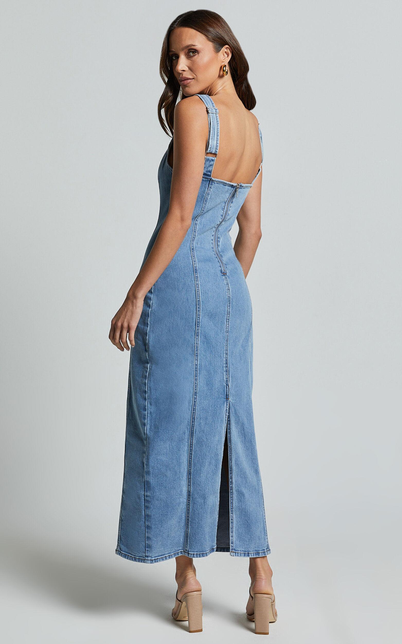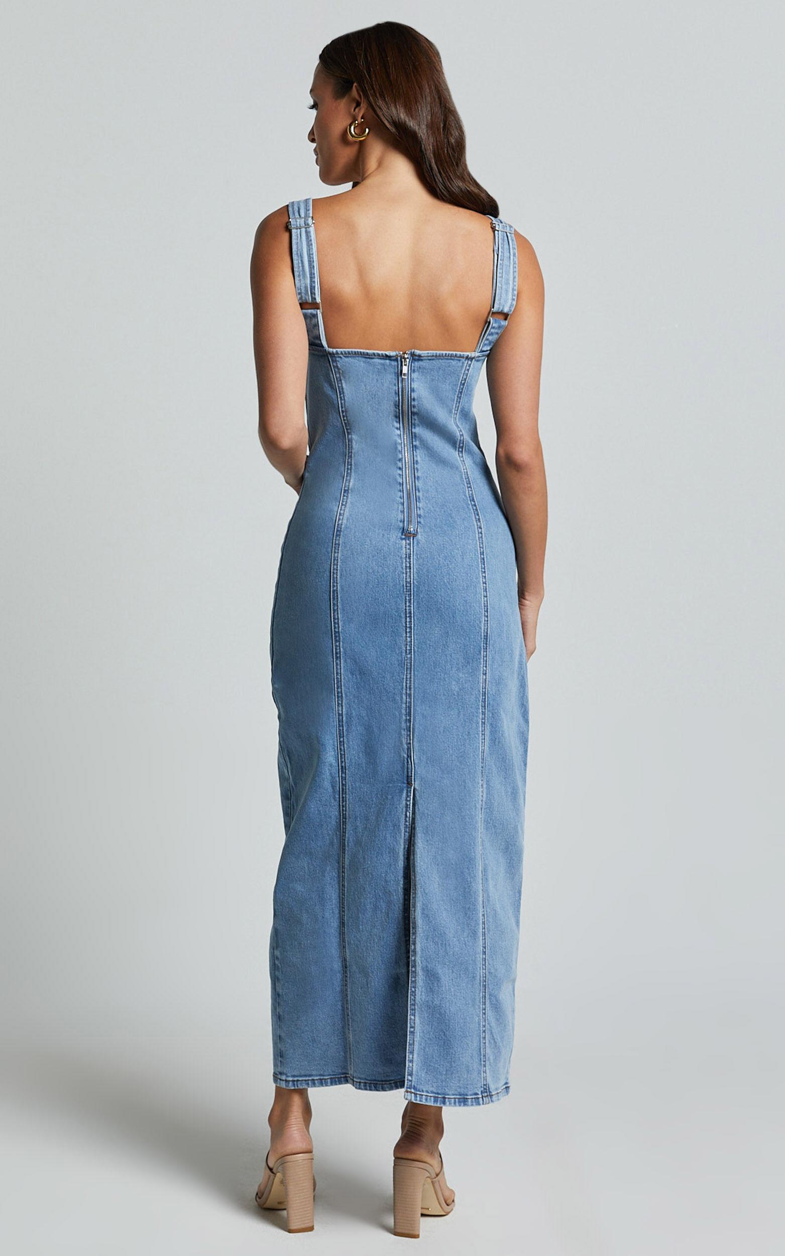 Make a statement with our Zenith Midi Dress. This blue denim dress features wide straps and panel detailing for an effortlessly cool look. Made from comfortable cotton, this fitted dress is perfect for both casual and dressed-up occasions. The square neckline adds a modern touch, while the midi length keeps it on-trend. Whether you're going out with friends or heading to brunch, our sleeveless Zenith Midi Dress will have you looking stylish and chic all day long.Product Details:Fitted dressesDenim fabricSquare necklineCasual wearMidi lengthSleeveless designCotton materialSize and FitSize S / 8 length: 133cm / 52.36inMaterial and Care50% Recycled Cotton, 50% CottonNo Stretch