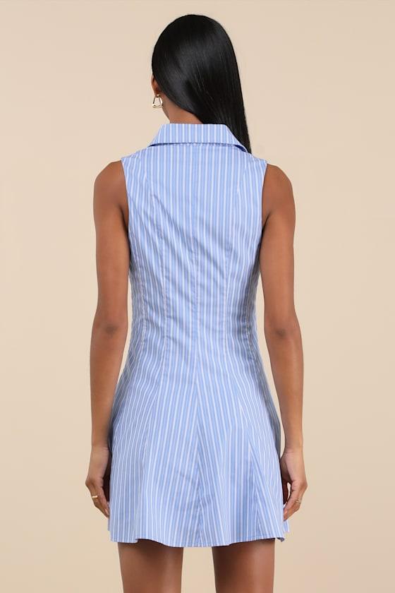 A chic piece with a lightweight woven construction that is perfect for warmer weather, this striped dress is bound to be a closet favorite. The sleeveless, fit-and-flare silhouette features a classic collared neckline and a twirly, skater-style mini skirt that is ideal for strutting around town. Hidden side zipper/clasp.