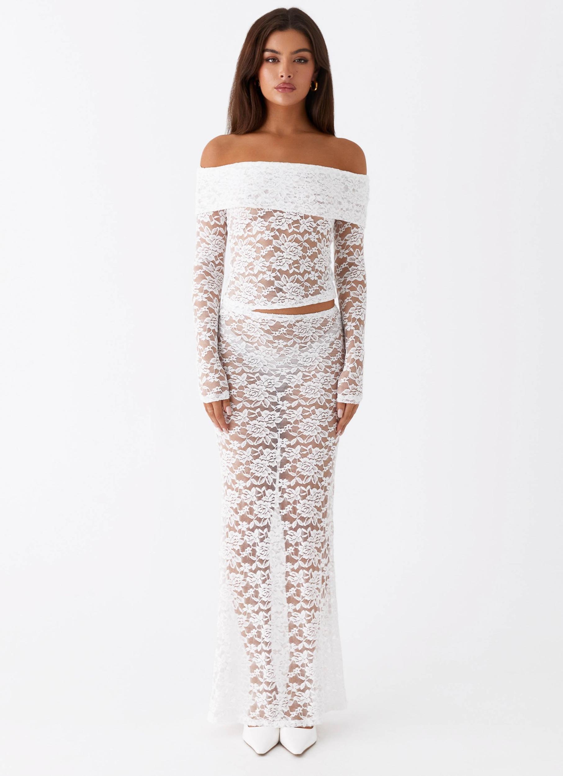 Peppermayo Exclusive Embrace the romance of twilight with the Zephyra Lace Long Sleeve Top. Featuring an alluring off-the-shoulder neckline, a graceful fold-over panel at the neck, and elegantly long sleeves, it's designed for those captivated by moonlit evenings and the allure of nightfall. - Mid-length top- Off-the-shoulder neckline- Fold over panel at neck- Semi-sheer- Unlined- Stretch lace- Long sleeves- 100% Lace Size AU 8 / US 4 garment measurements: Bust: 76 cm / 29.92 inHem: 70 cm / 27.56 inSleeve: 57 cm / 22.44 inLength: 41 cm / 16.14 in Olivia is 170cm and wearing a size AU 8 / and US 4