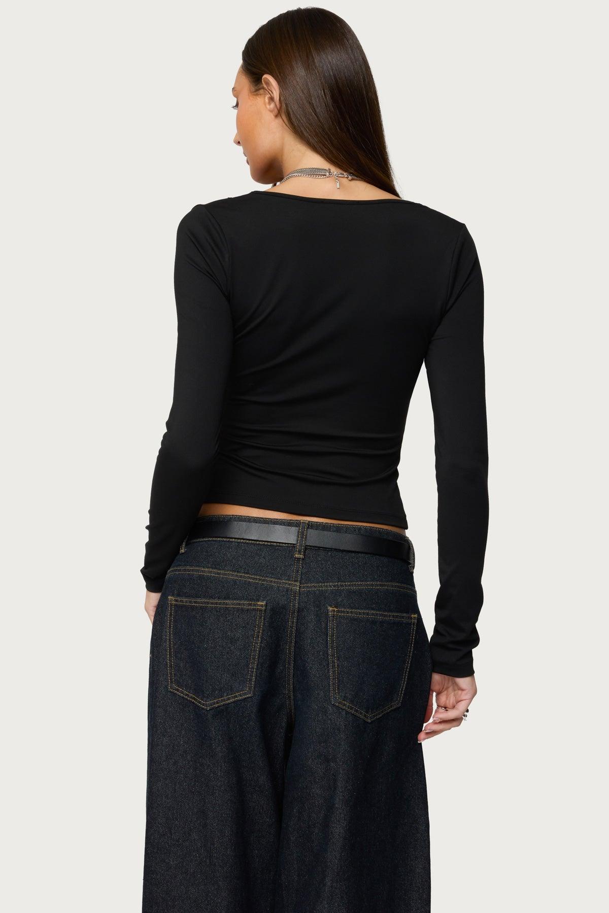 Top Long sleeves Square neckline Button detailing Keyhole cutouts Lace trim Polyester, Spandex Model wears size S Model height is 5'9 Item care: Machine wash at maximum 30ºC, wash with similar colors, do not bleach, do not tumble dry, iron at a maximum of 110ºC, do not dry clean