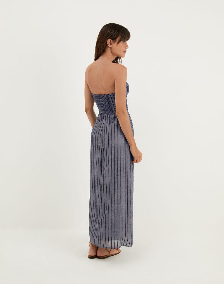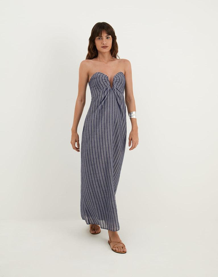 The ViX Zhen Long Dress is a strapless maxi silhouette featuring a sweetheart neckline with a subtle front dip and soft, natural ruching. Designed with an allover pinstripe pattern, it’s finished with a smocked back and concealed zip closure for a flattering, comfortable fit. Style the Zhen Long Dress with sandals and
