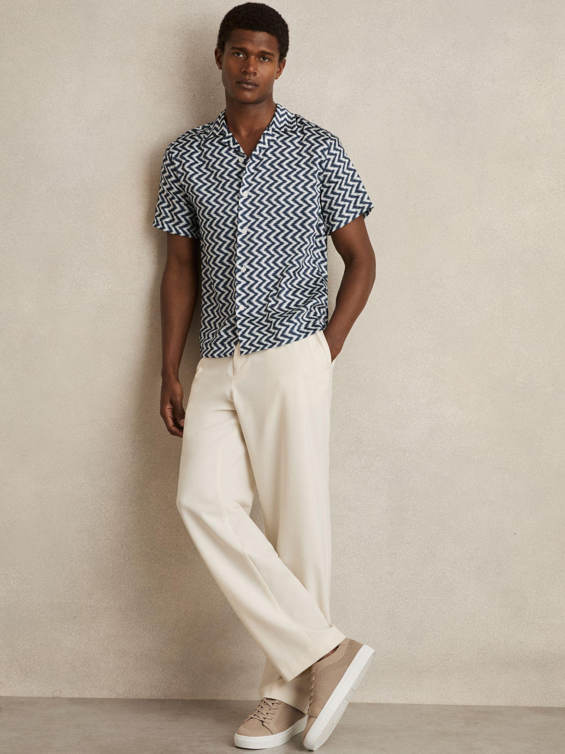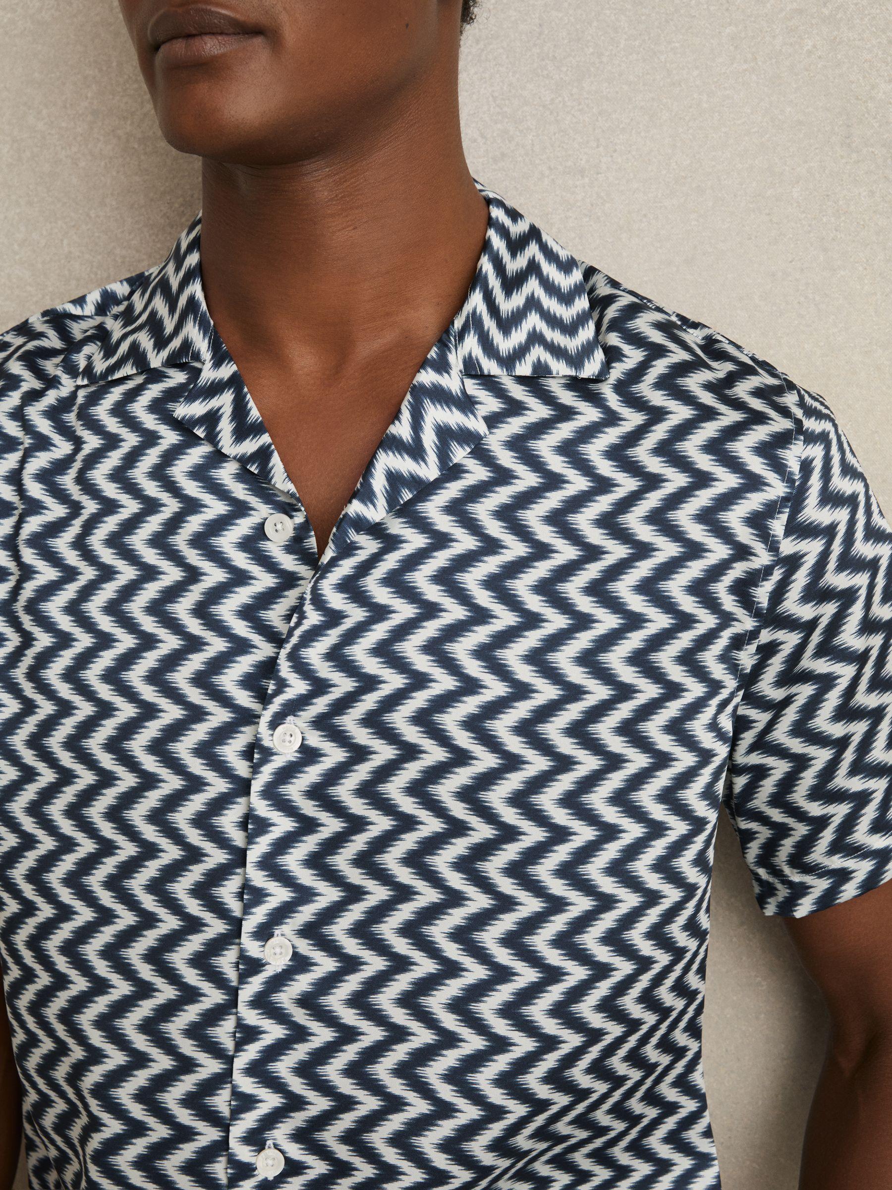 Zig-Zag Print Cuban-Collar Shirt in Navy