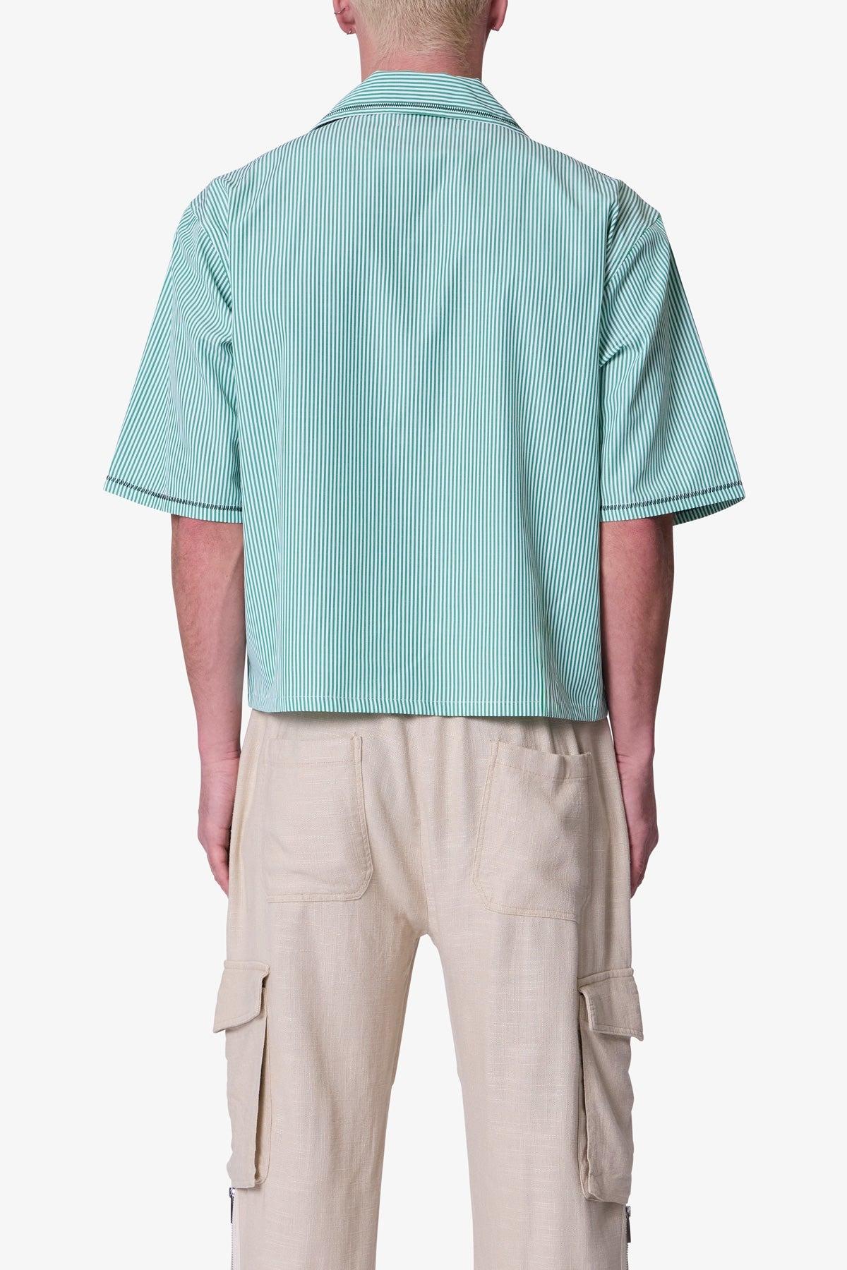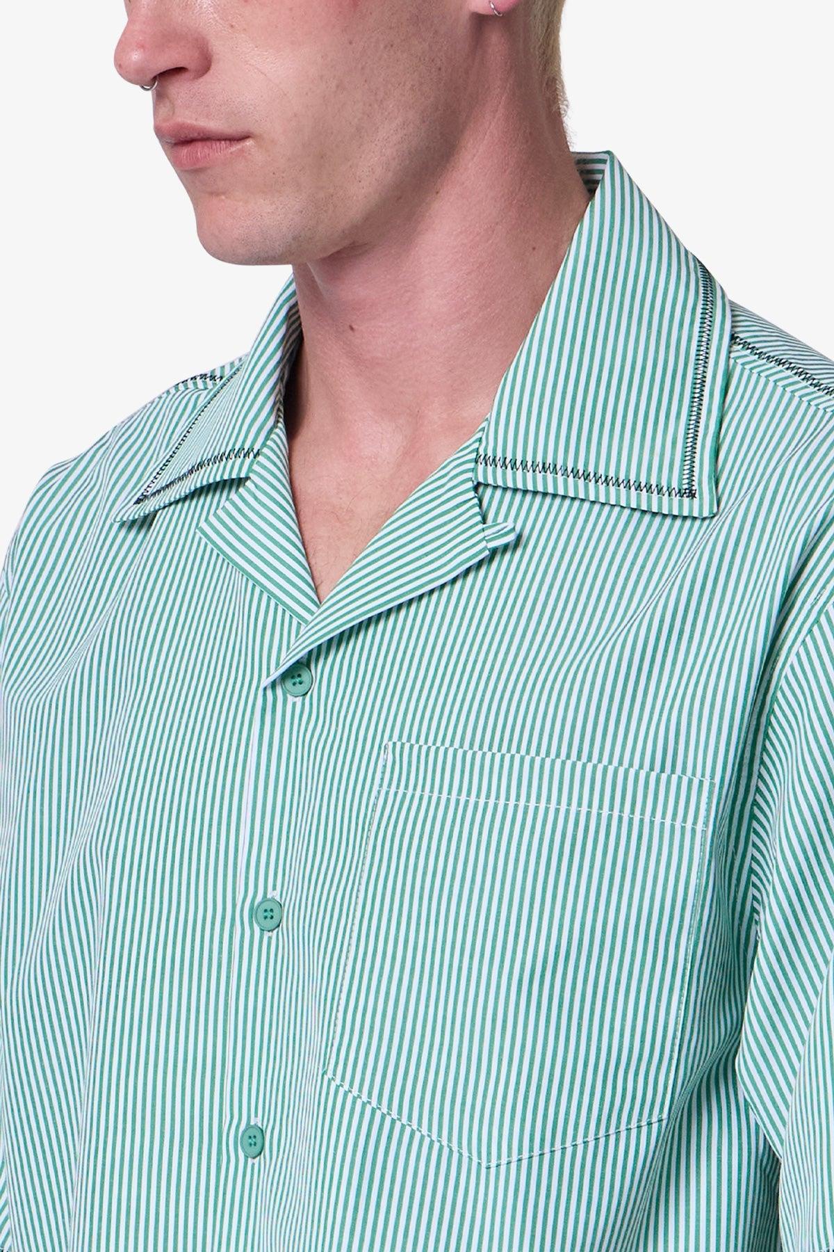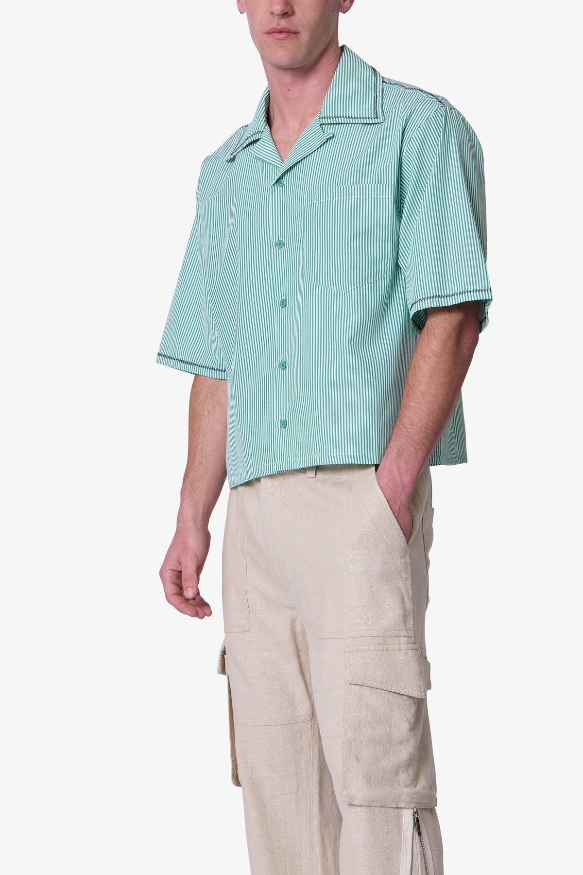 Constructed from a cotton-poly poplin with a fabric wash, this boxy, cropped camp collar shirt features green vertical stripes and contrast zig zag stitch embroidery at the sleeve openings, collar, and shoulder seams. Finished with a chest pocket and front button closure. details Boxy, cropped fit 78% cotton, 22% polye