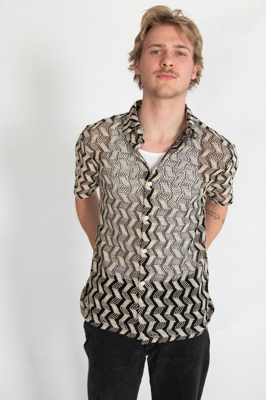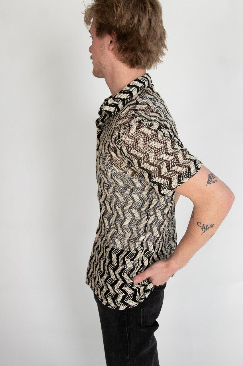 PX Clothing Short Sleeve Camp Neckline Vertical Zig-Zag Woven Shirt