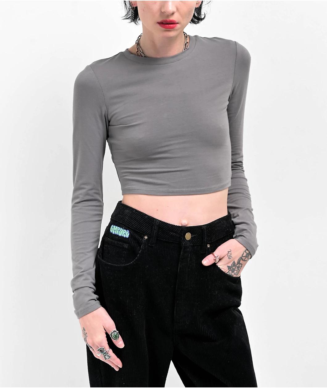 From Zine comes the Havanna buckle t-shirt in a long sleeve, crop construction with a plain grey colorway for easy pairing. This cotton blend tee features an open back design with an adjustable metal buckle for a secure fit and a dimensional look.