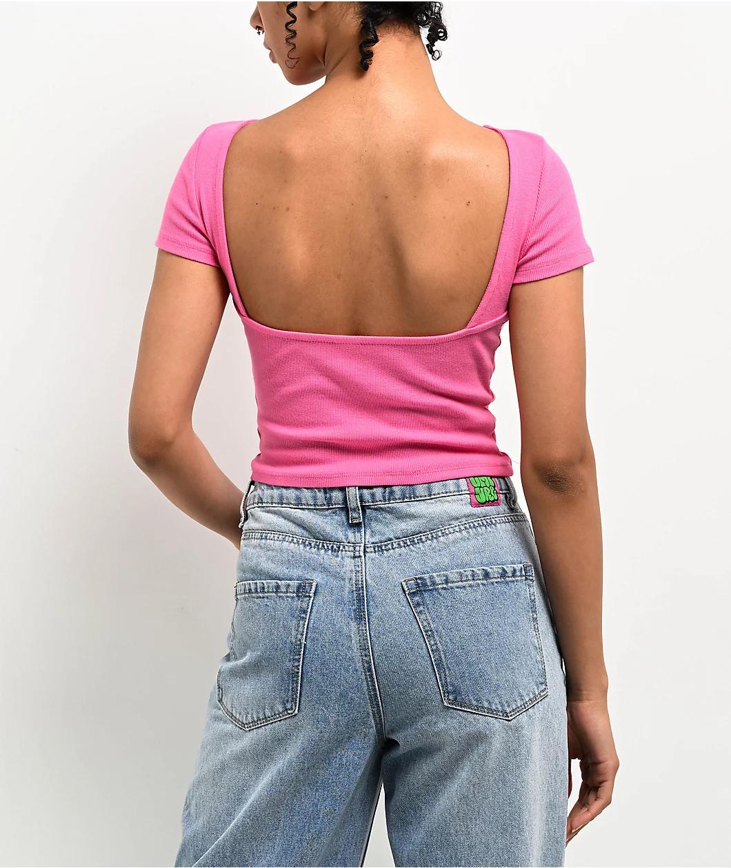 Arriving in a bright pink hue, Zine offers the Rita crop t-shirt with an open back silhouette and a rib-knit, stretchy slim-fit. Built using a cotton-spandex blend, the short sleeve shirt is an essential addition to the wardrobe for casual weekly wea