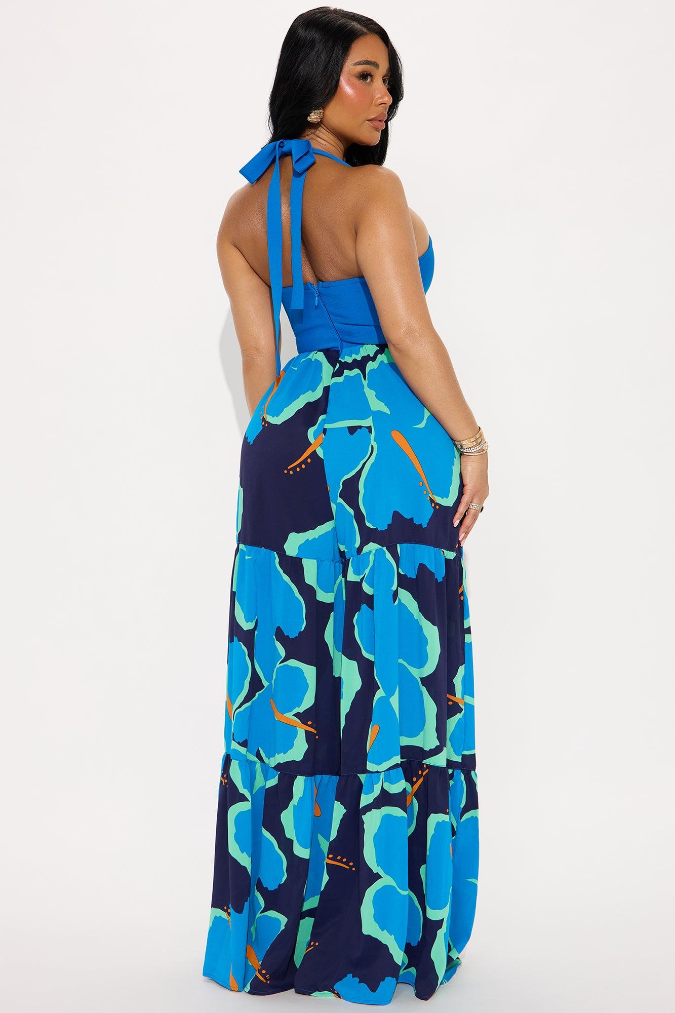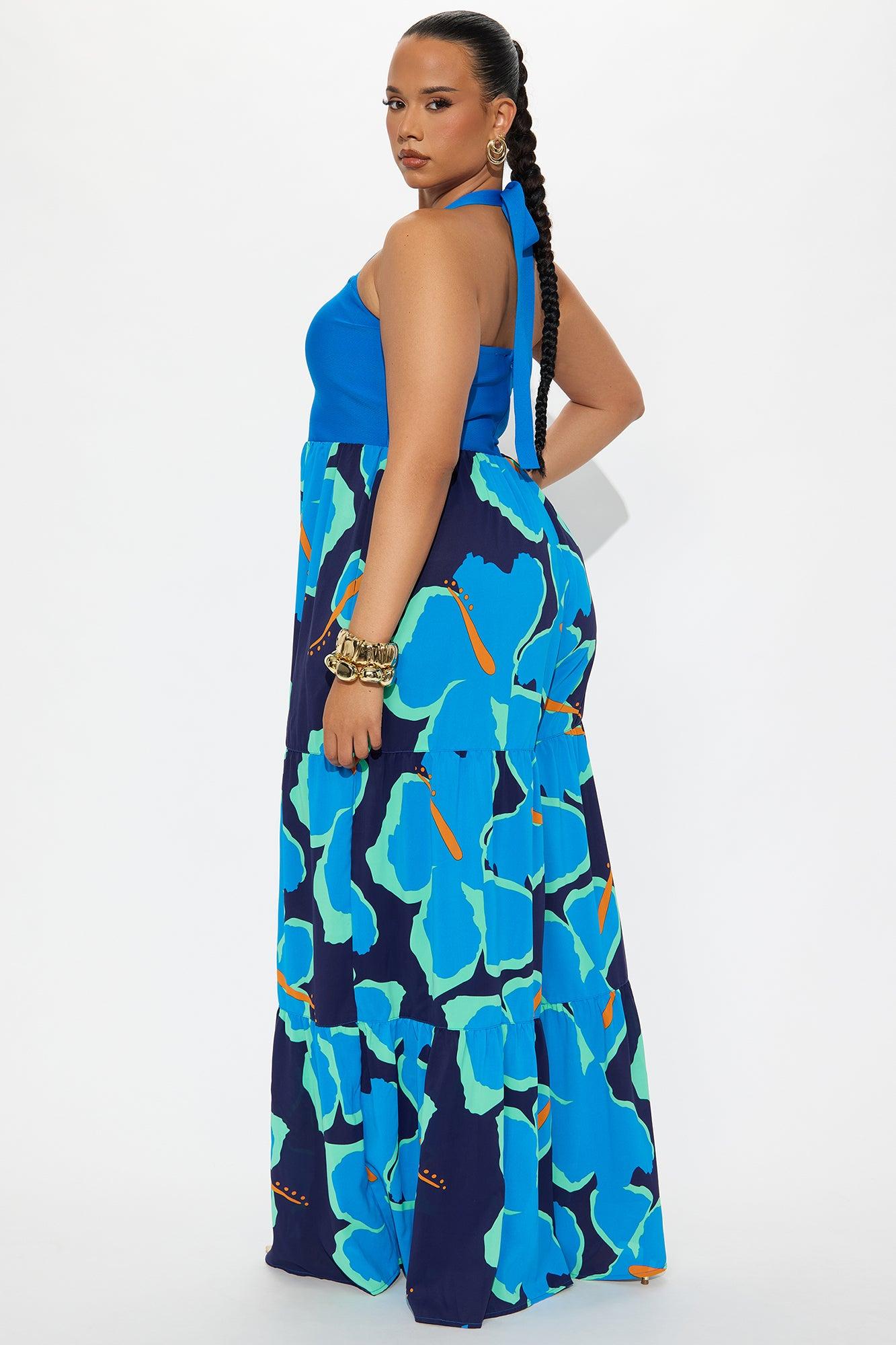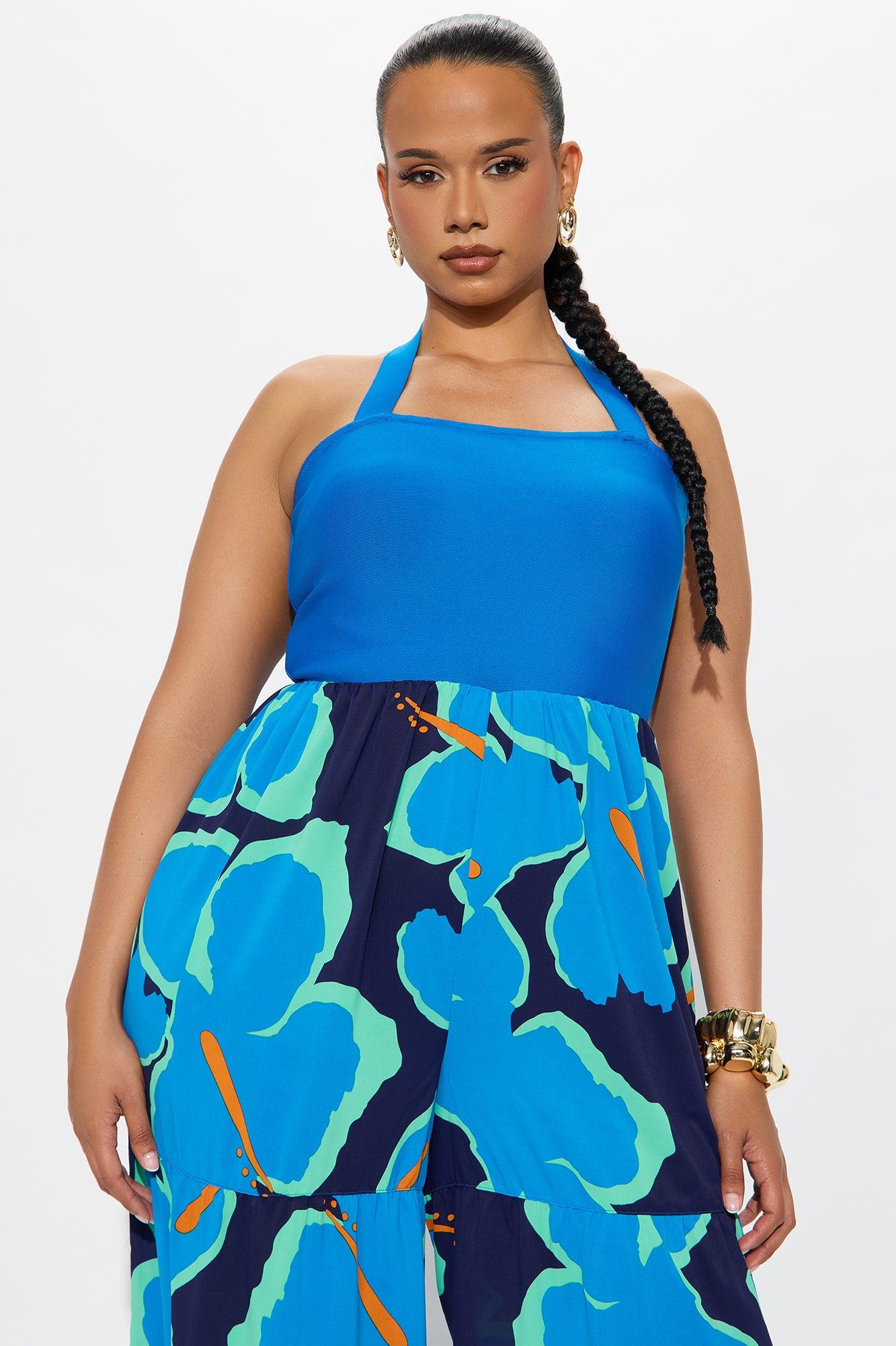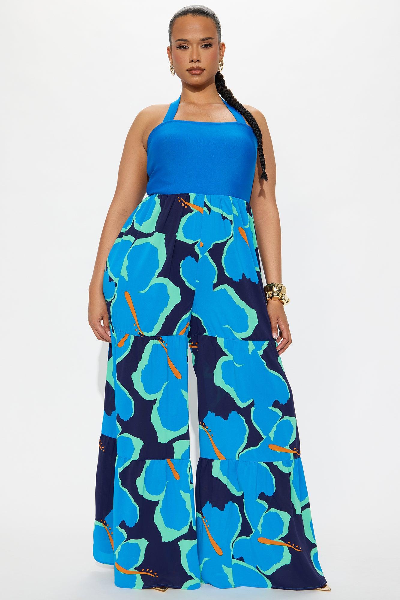 Available In Blue/combo. Jumpsuit Bandage Top Back Neck Tie Detail Invisible Back Zip Closure Tiered Wide Leg Inseam = 29" Non Stretch Disclaimer : Design Pattern Placement Will Vary Self: 92% Polyester 8% Spandex Contrast: 100% Polyester Imported