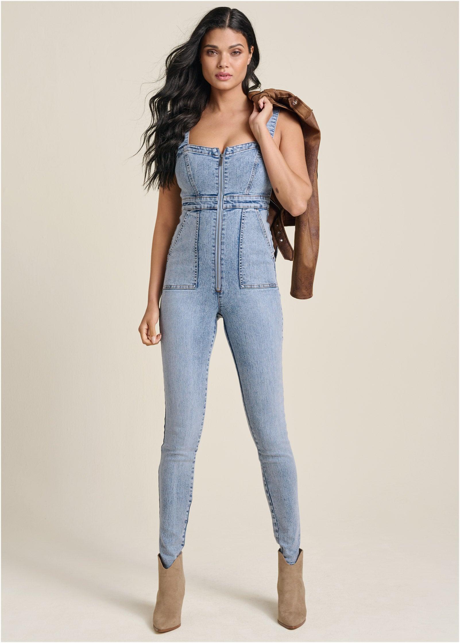 Turn some heads in head-to-toe denim with the ease of a figure-hugging jumpsuit. Adjustable shoulder straps customize the fit and the front zip closure lets you decide how much to reveal. Strategically-placed seams accent your curves and the skinny-jean fit of the legs are smoothest when tucked into booties. * Availabl