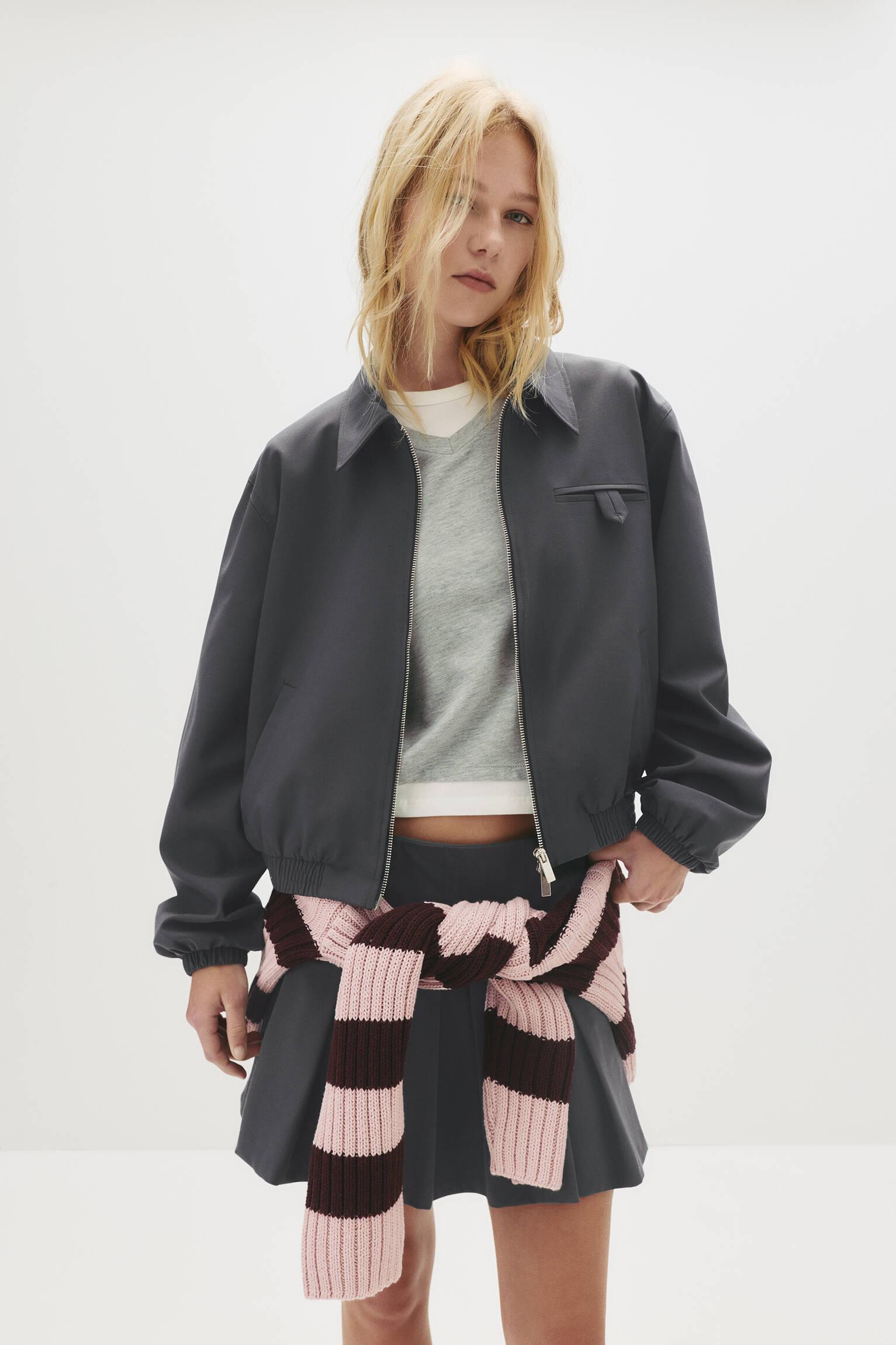 Cropped bomber jacket with zip fastening, Kent collar, and front pocket.