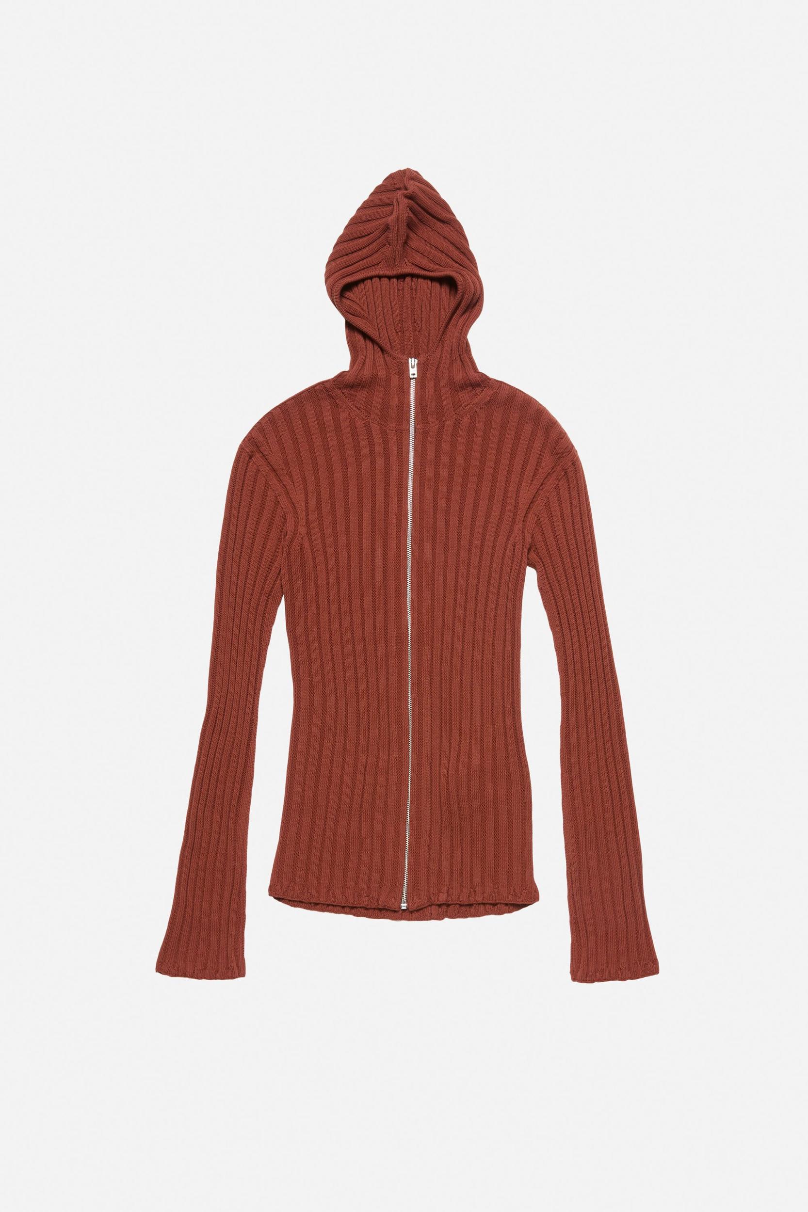 Zip-up hooded cardigan crafted from compact crepe ribbed cotton, featuring irregular rib detailing at the hem and cuffs, and a seasonal label at the back neck. Cut to a fitted style and hip length. FN-UX-KNIT000027
