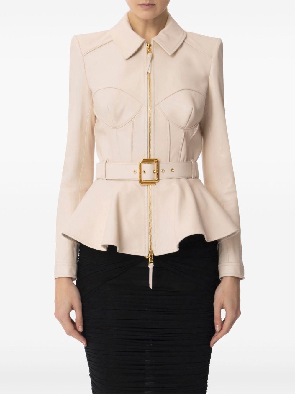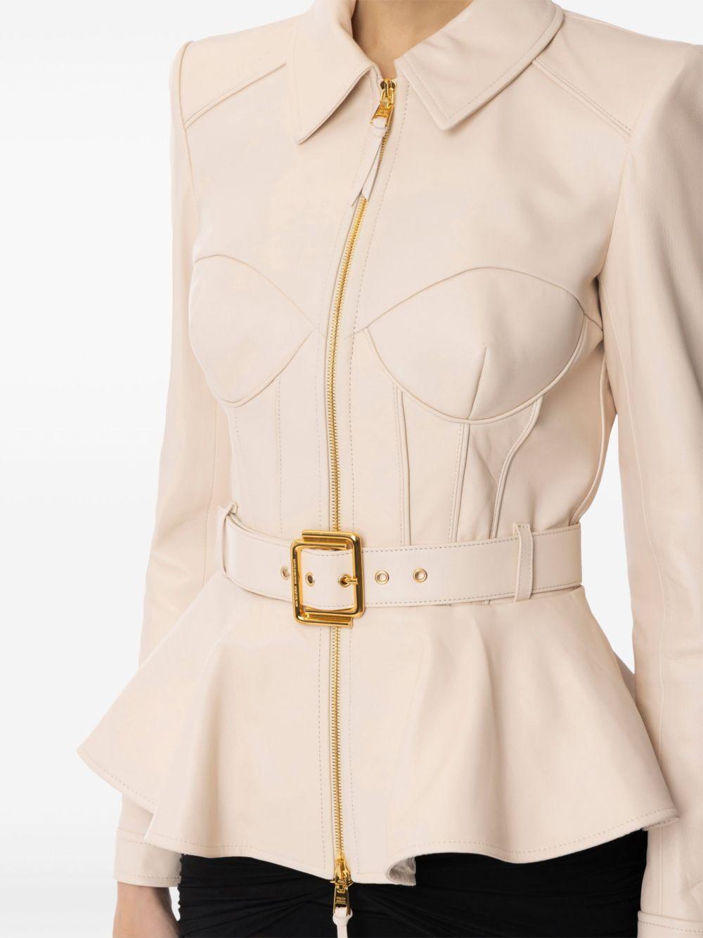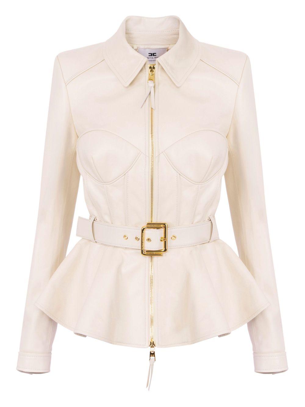 Elisabetta Franchi zip-up leather jacket | Neutrals | beige | front zip fastening | detachable and adjustable waist belt | long sleeves | peplum hem | Nappa Leather | Leather Jackets | Jackets | Clothing | Women