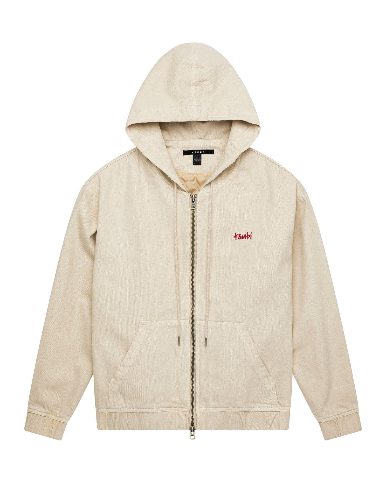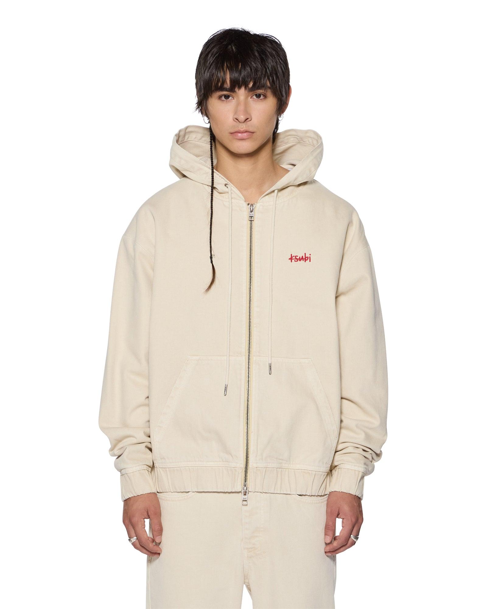 The Zipped Denim Hoodie Ecru is an oversized fit zip-through denim hooded jacket. Made from premium rigid overdyed tan denim with a heavy stone wash and contrast wearing, it features elasticated hem and sleeve cuffs, a padded quilted lining, and Ksubi's 1999 logo embroidered at the front crest. The jacket includes front pouch pockets and a double-ended zipper closure. Finished with tonal signature T-box and 4x4 embroidery and Ksubi branded hardware.
