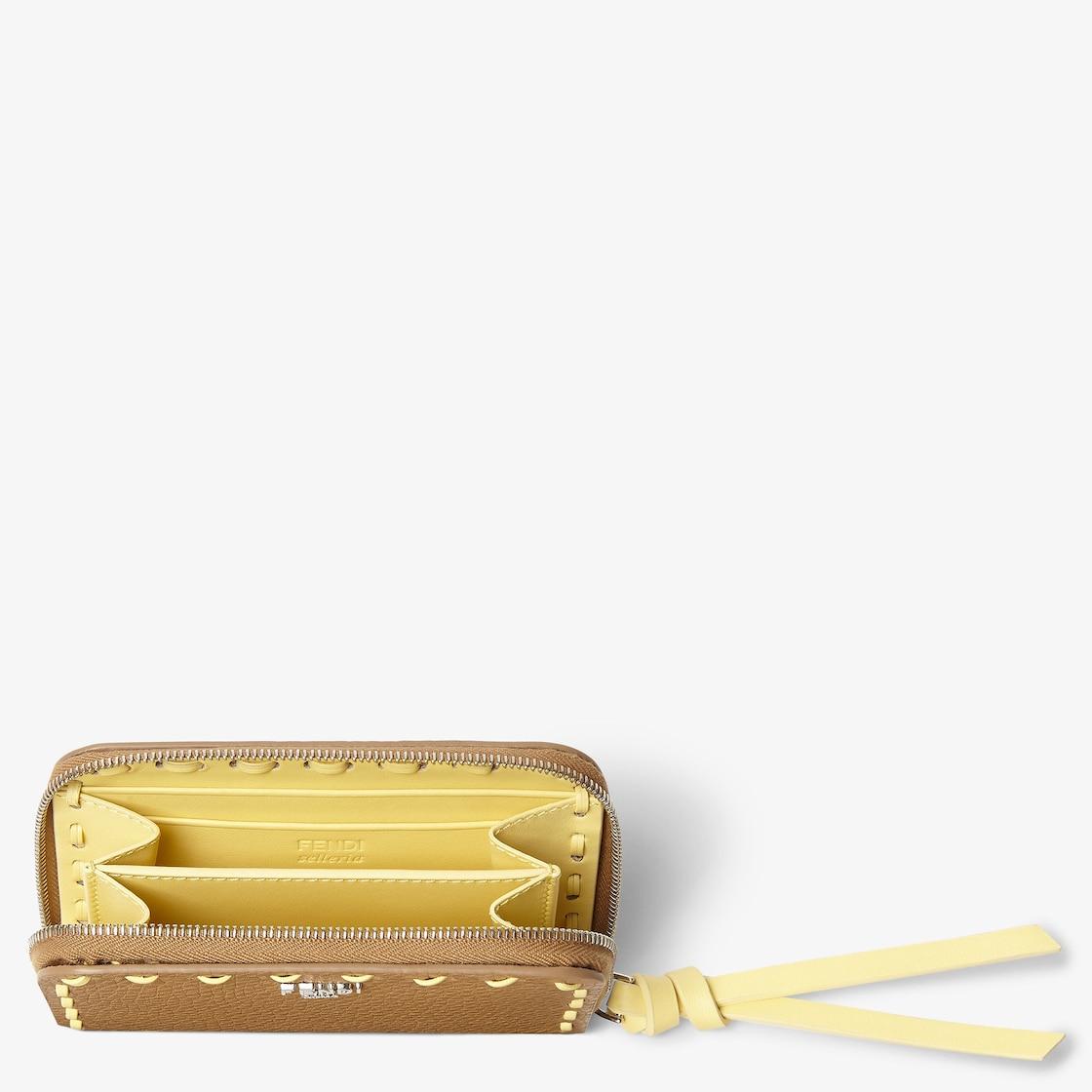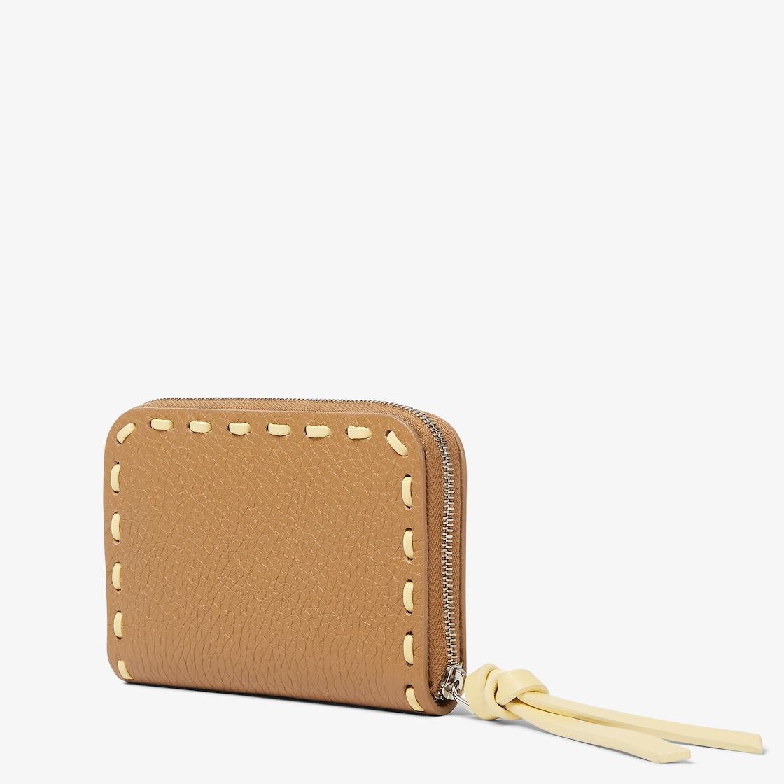 Mini Peekaboo wallet with zipper closure along three sides. Interior with two gusseted compartments and card slots. Made of cappuccino-colored Cuoio Romano leather, finished with 72 hand-sewn, contrasting topstitches, an emblem of the iconic Selleria stitching handed down through generations of Fendi artisans since 1925. Palladium-finish metalware and metal FENDI logo. Made in Italy
