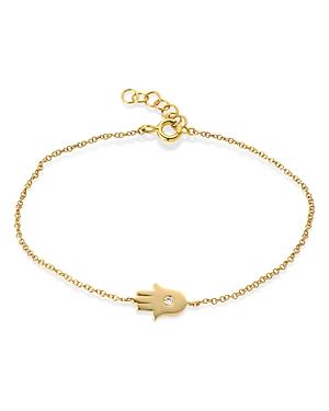 A symbol of fortune and fertility, this Hamsa hand charm is forged from timeless 14k gold with a petite diamond at the center. Hung from a slim chain, this bracelet is the perfect addition to your everyday collection. This item is made to order, please allow 1-2 weeks to ship. 14k gold and diamond Diamond: 0.02 tcw Diamond: sourced from Canada and the USA Spring ring closure Spot clean Made in the USA Size & Fit Length: 6.5in Extender: 0.5in Charm width: 10mm Charm height: 7mm | Zoe Lev Womens Diamond Hamsa Bracelet in Gold