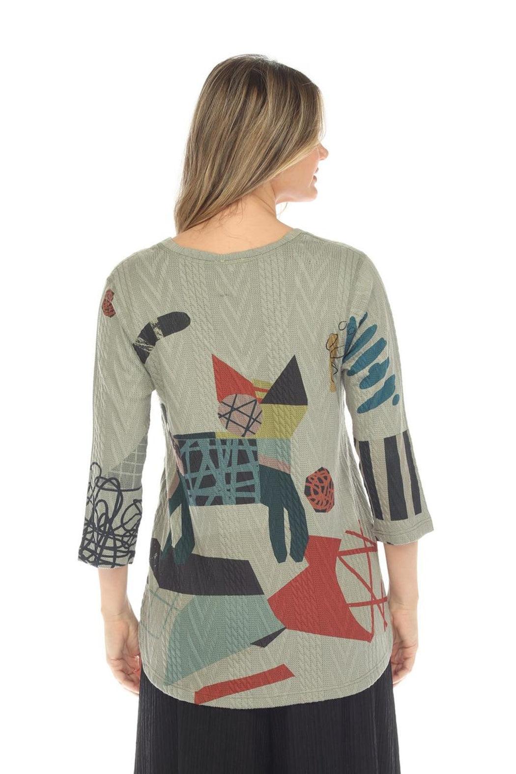 Inoah - a "Made in the USA" whimsical & wonderful collection of tops, tunics & dresses! This long top features a v-neck, 3/4 sleeves, a simple Aline cut and a curved hem. The textured sage is soft and comfortable. This piece comes in a fun "Zoe" print. So cute!