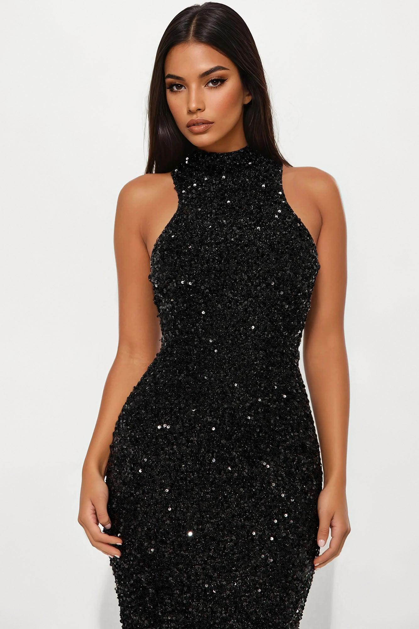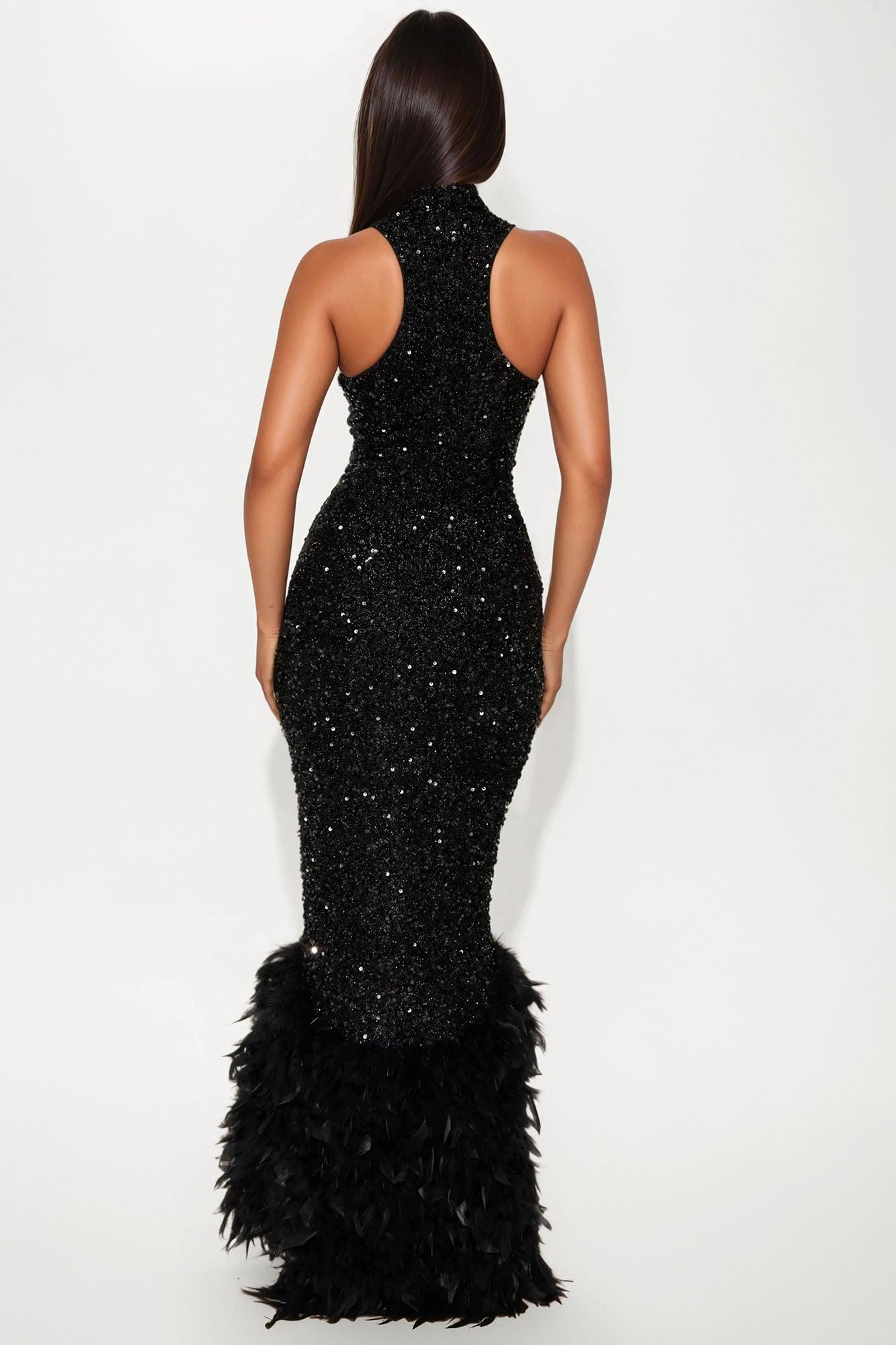 Available In Black And Red. Feathered Sequin Gown Mock Neckline Sleeveless Feather Trim Invisible Back Zipper Stretch Disclaimer Feather Fall Out May Happen Self : 100% Polyester Lining 1 : 97% Polyester; 3% Spandex, Lining 2 : 100% Polyester Imported California Proposition 65WARNING: Cancer and Reproductive Harm - www.P65Warnings.ca.gov.