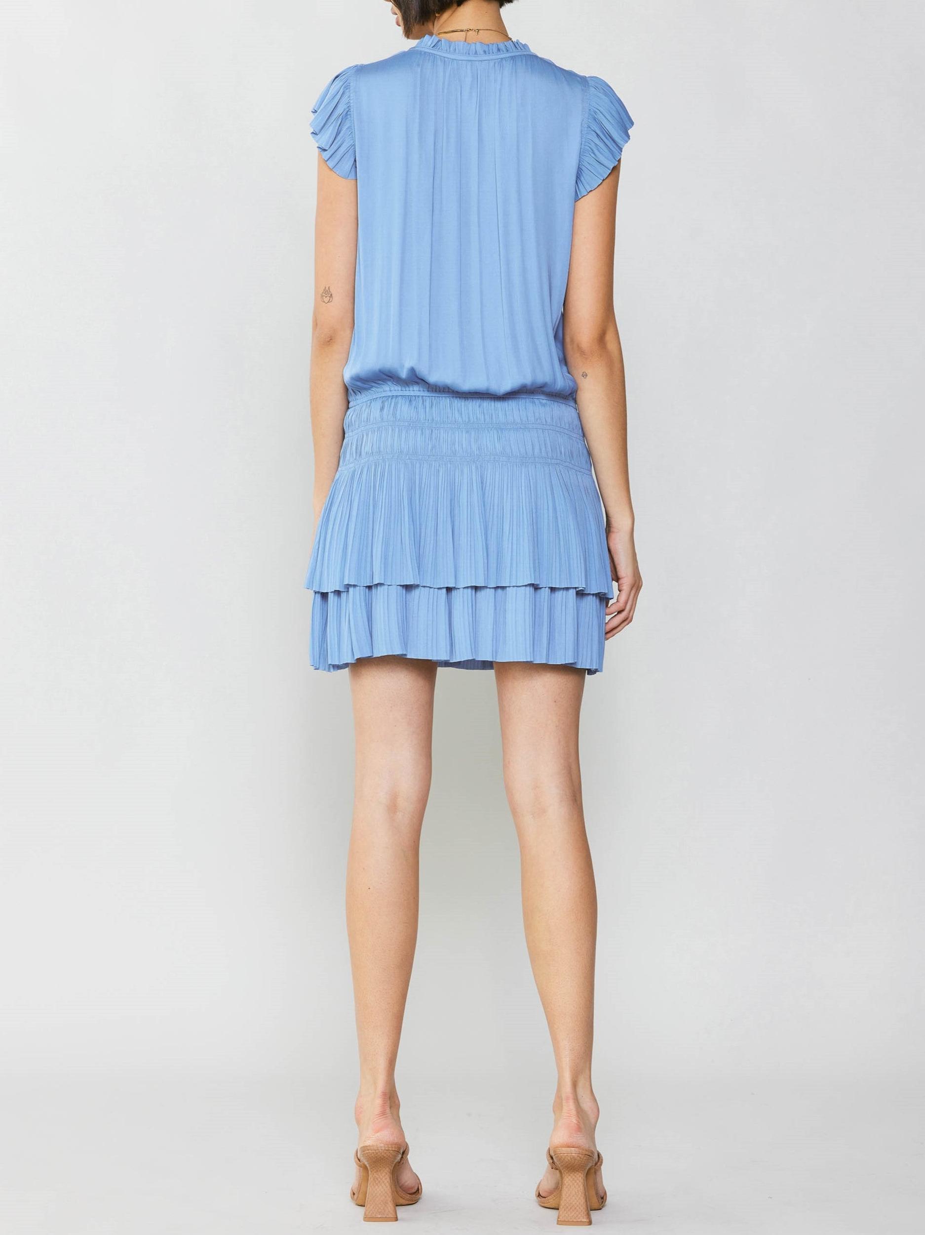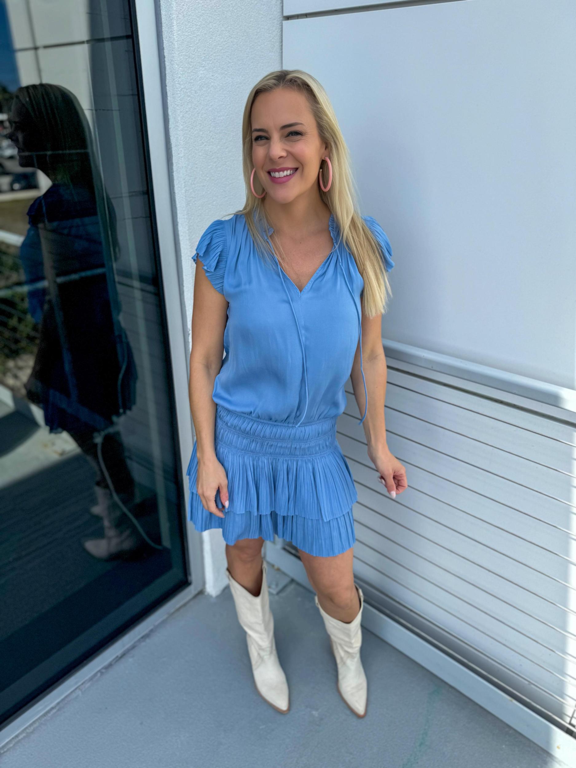 Done in an alluring dusty blue shade, this short-sleeve mini dress ties up at the neckline and cinches I at the waist before falling to a thigh-skimming tiered hem with crisp, raw edges. The perfect one-and-done number for date night- not to mention one of Current Air's most popular dress.