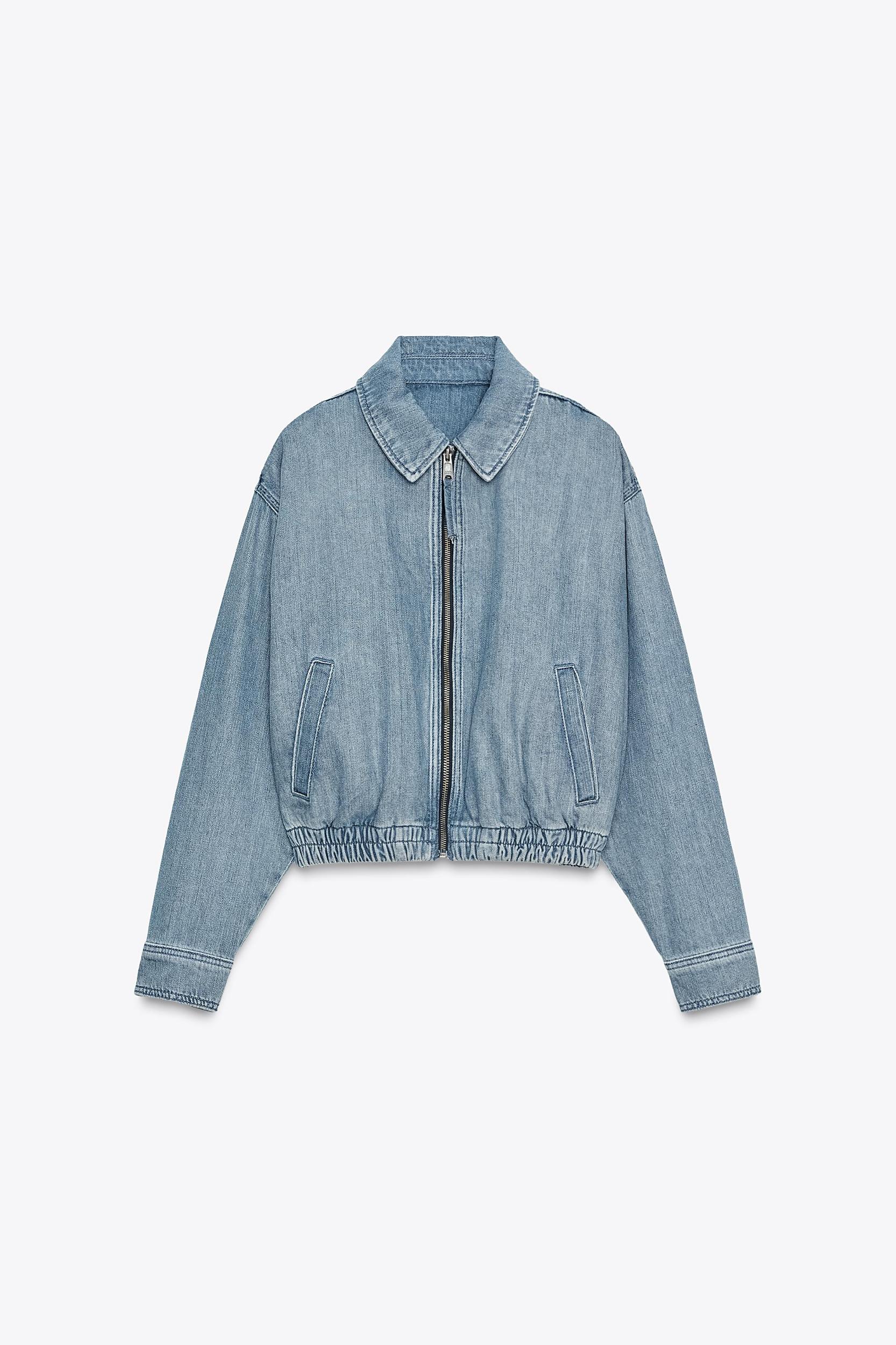 ZARA WOMAN COLLECTION Denim bomber jacket with a lapel collar and long sleeves with cuffs. Front pockets. Washed effect. Elastic hem. Front metal zip closure.