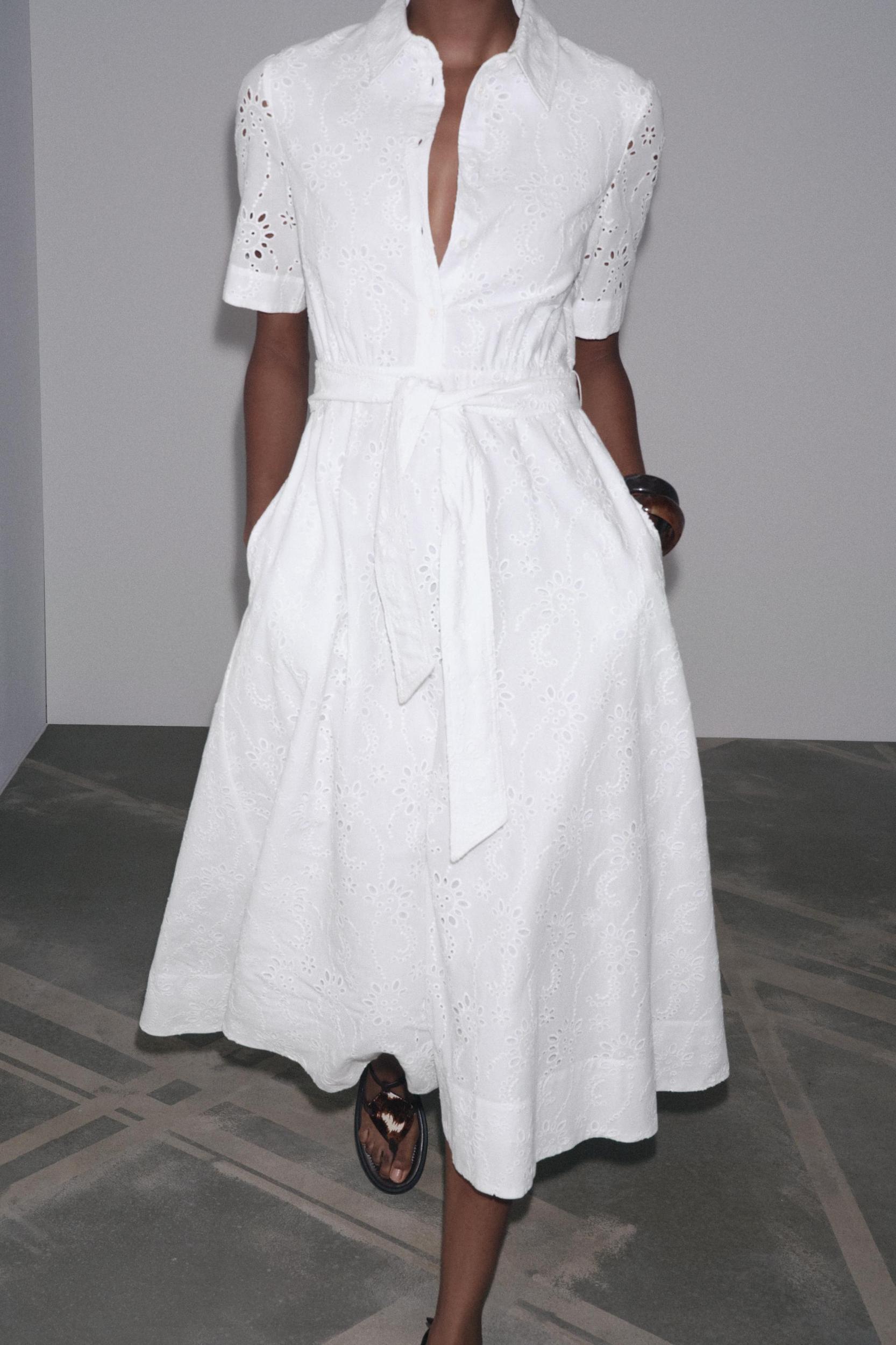 ZARA WOMAN COLLECTION Midi dress with a lapel collar and short sleeves. Matching adjustable tie belt. Tonal embroidered eyelet detail. Front button closure.