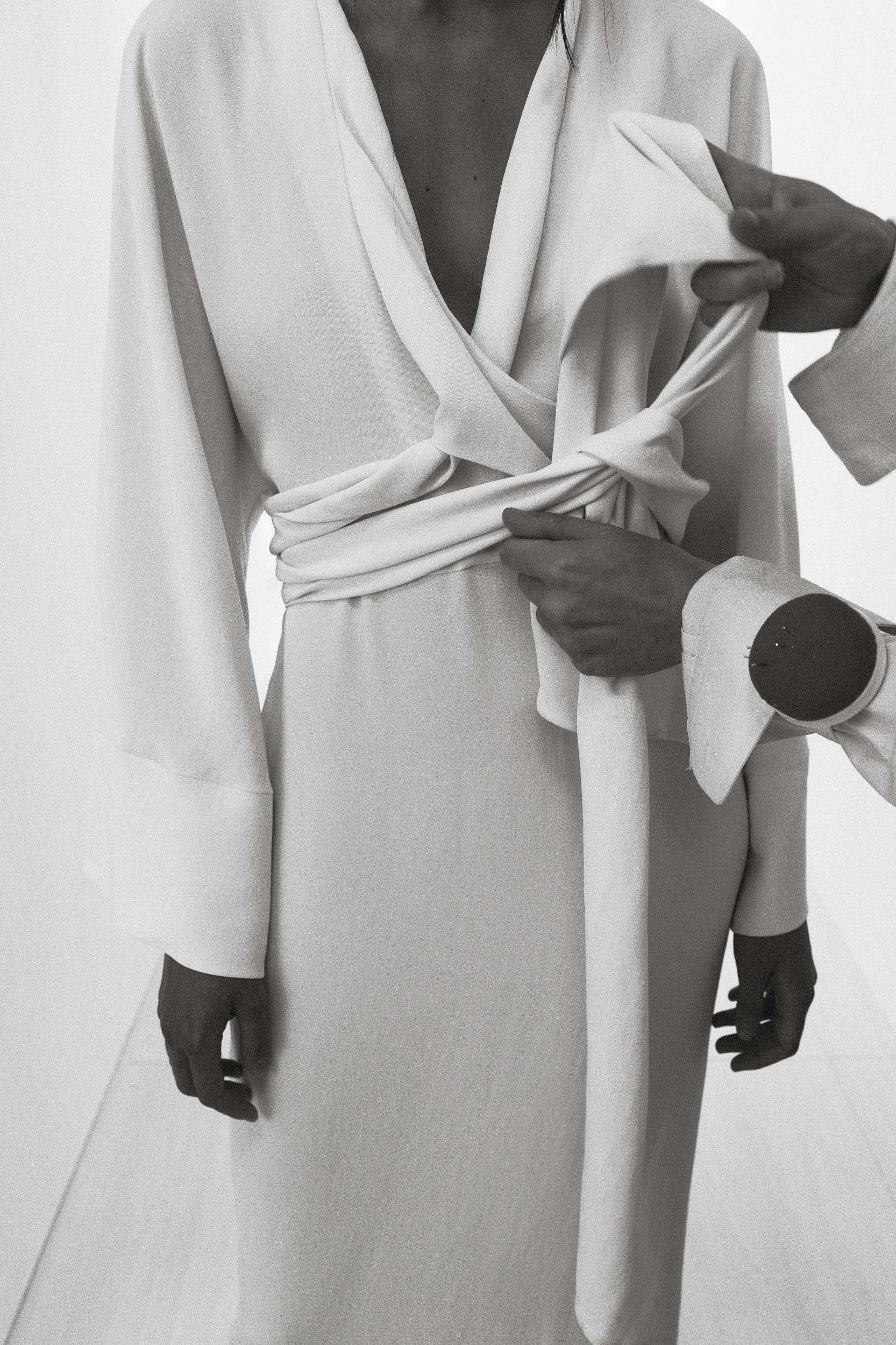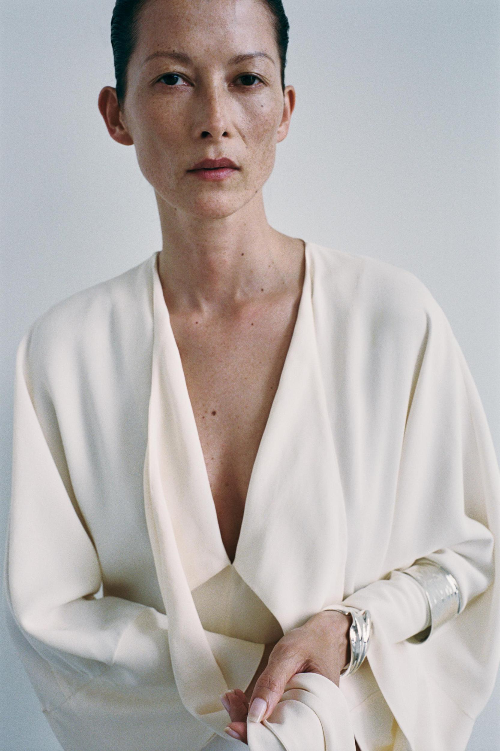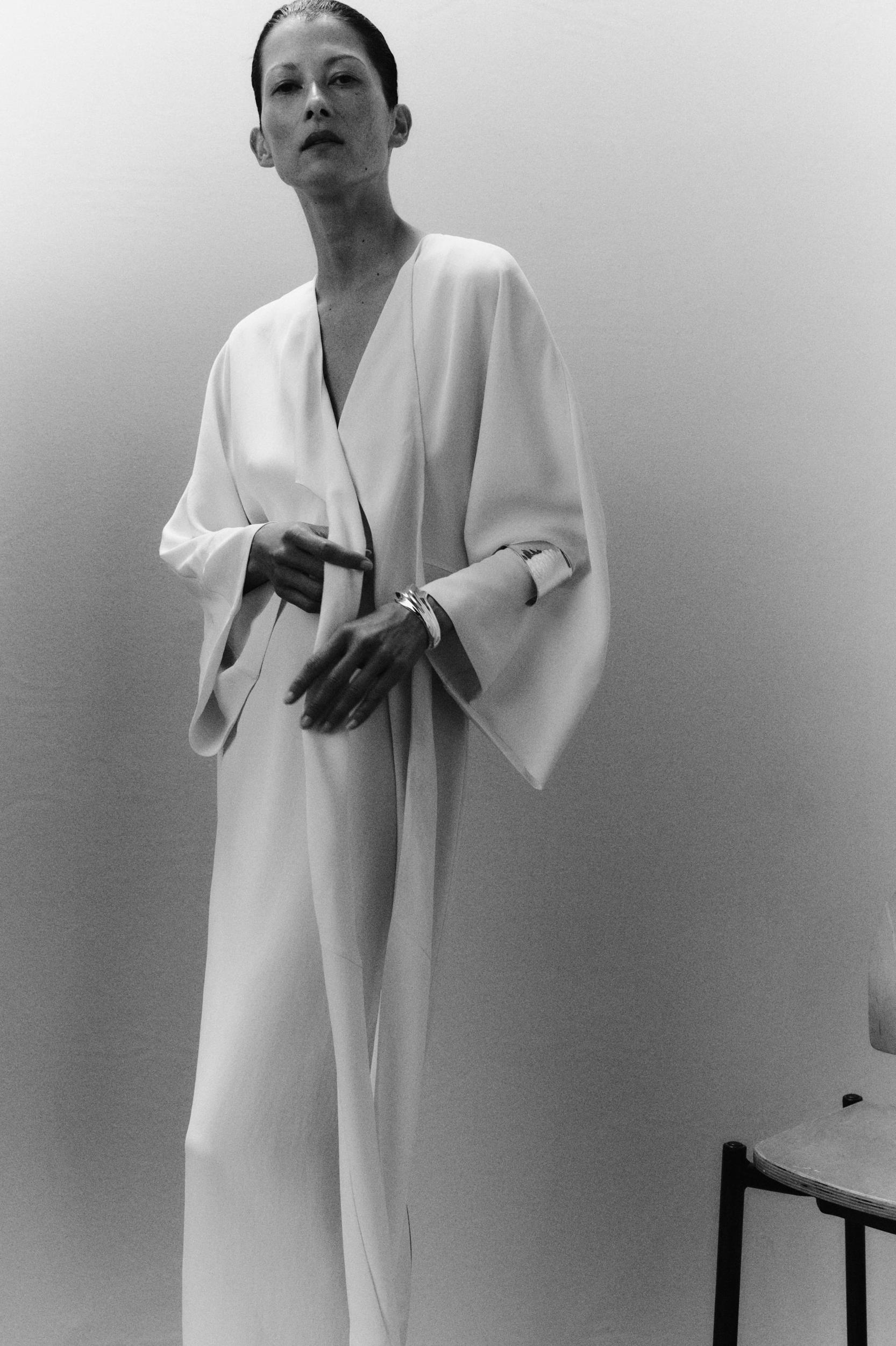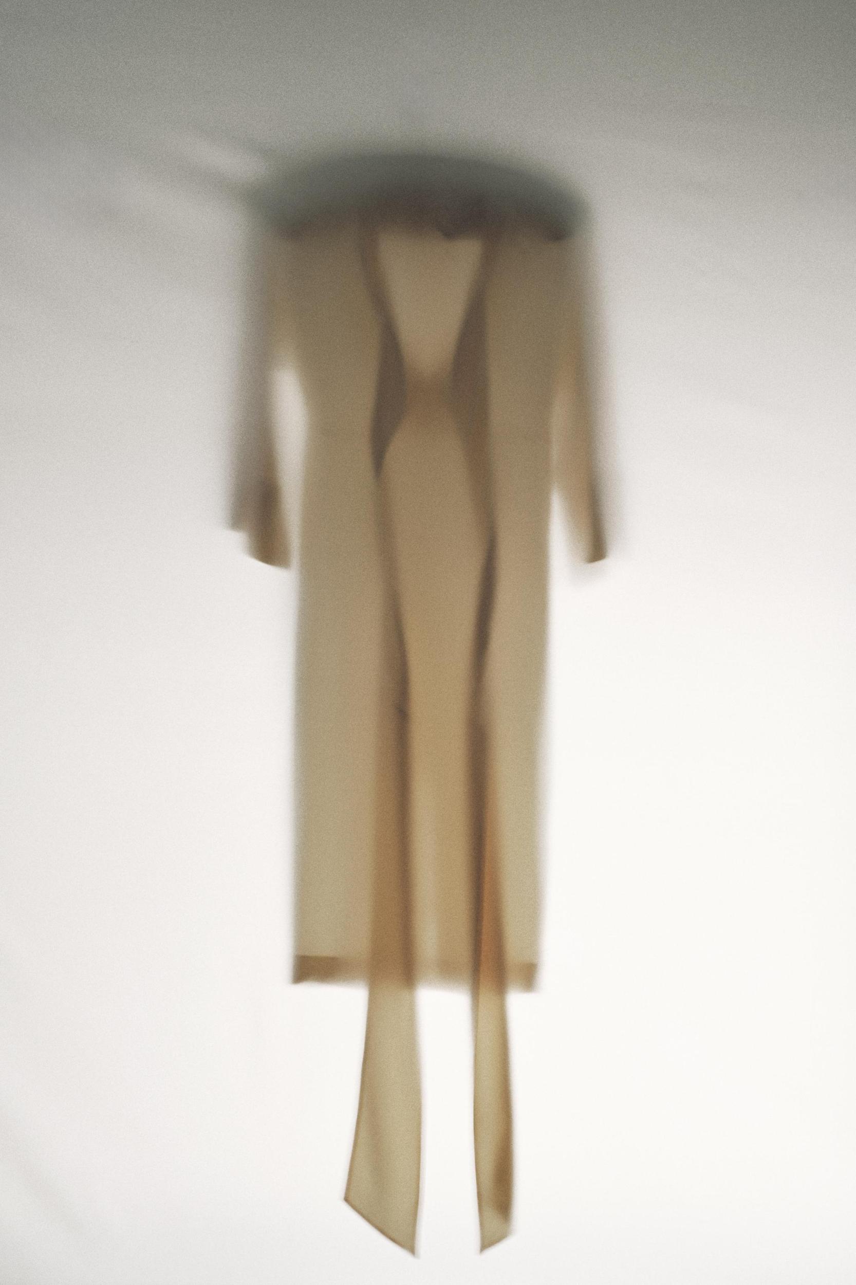 ZARA WOMAN COLLECTION Midi dress made of a viscose blend knit. V-neck and long sleeves finished with a flared hem. Adjustable waist with matching fabric ties. Straight hem.